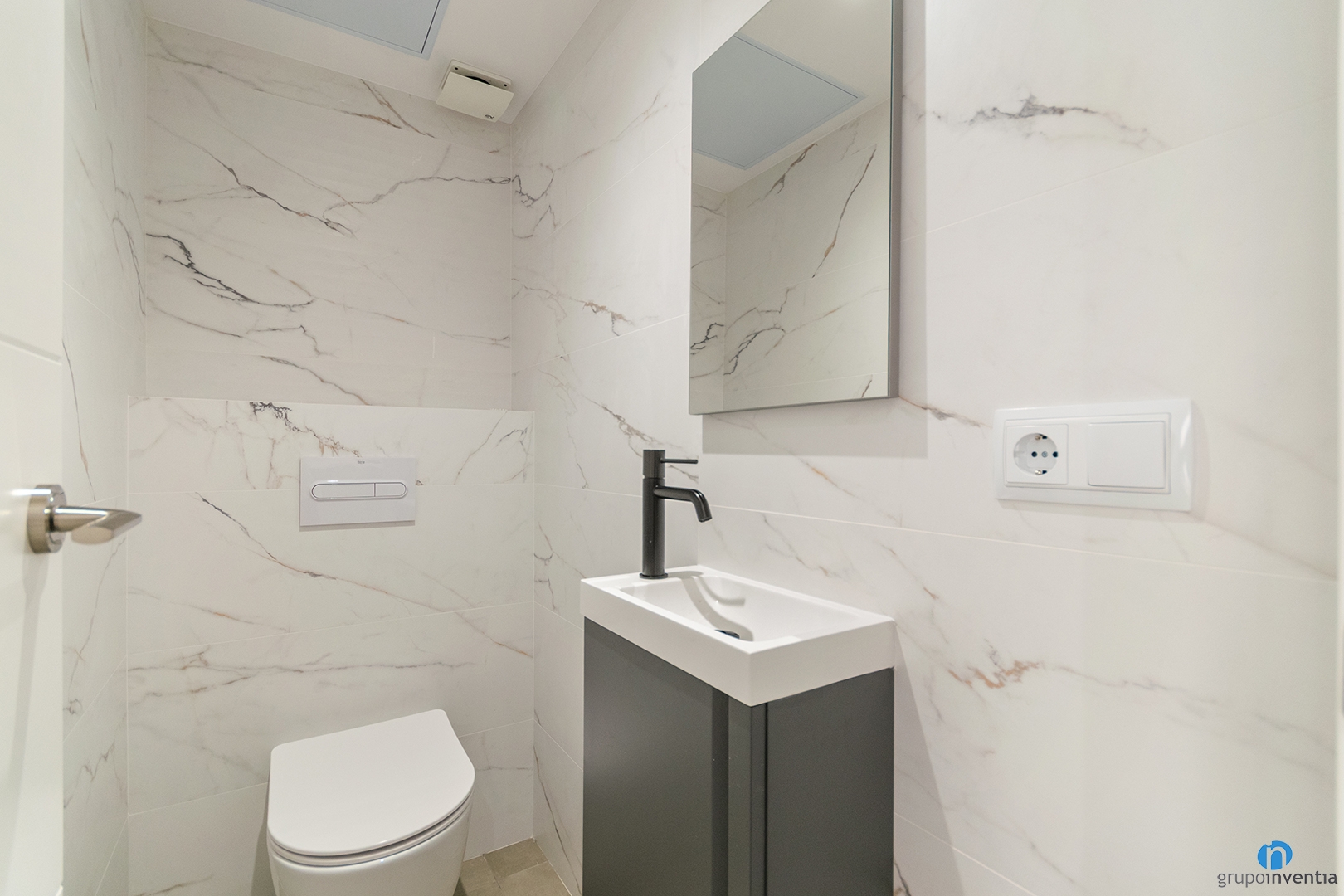The furniture has a grey finish combined with white marble-effect worktops. It is a stylish and elegant upgrade that fits perfectly within this integral renovation in Vilassar de Mar.