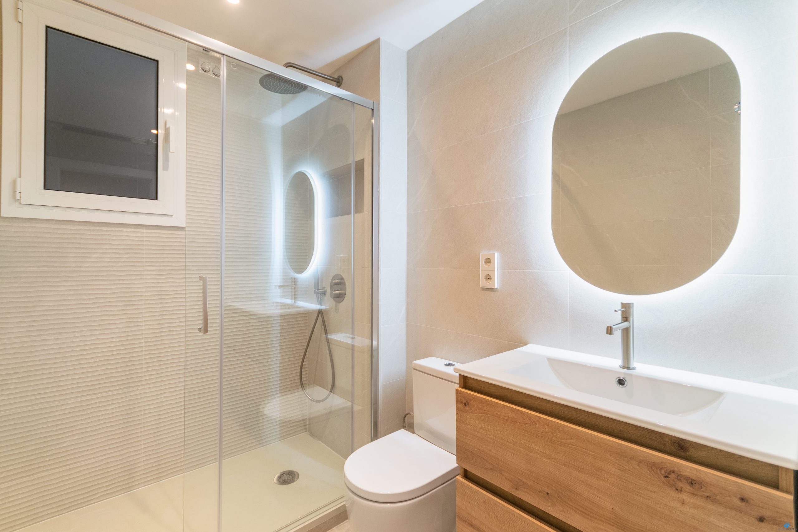 Walls feature neutral ceramic tiles that reflect light. The wooden vanity matches the home’s overall design. The backlit mirror adds a stylish and contemporary element.