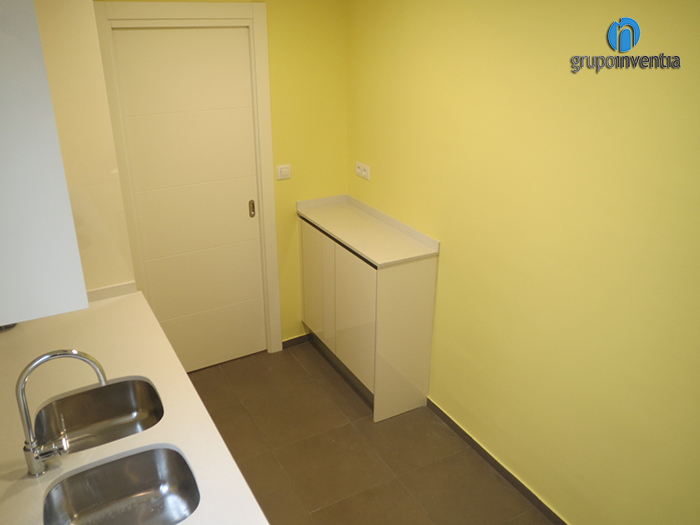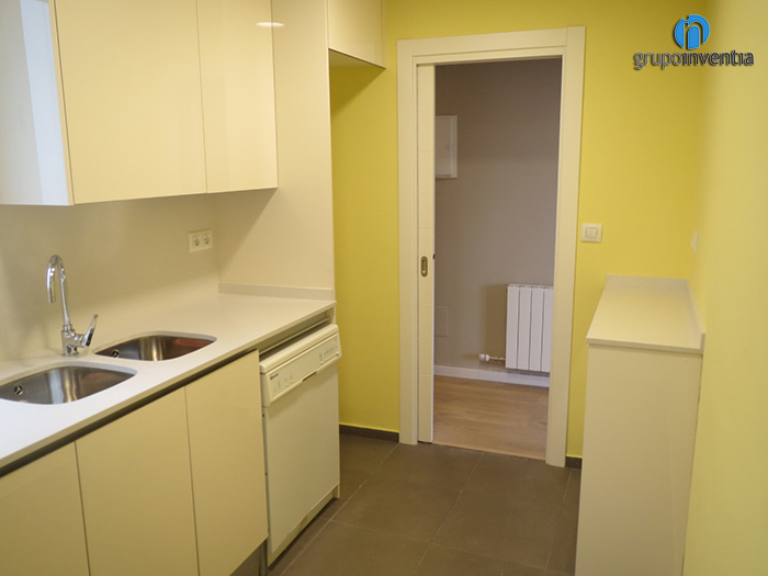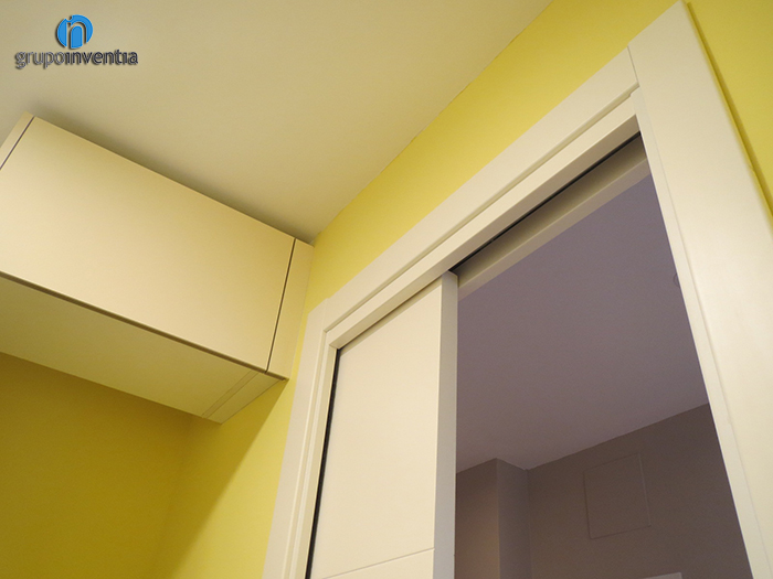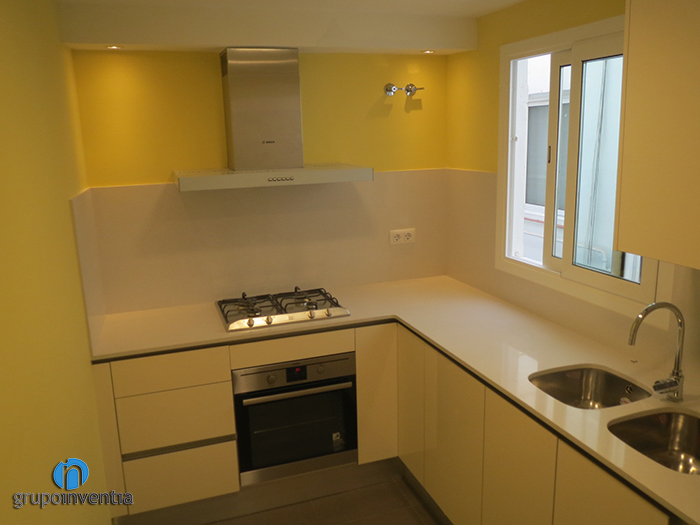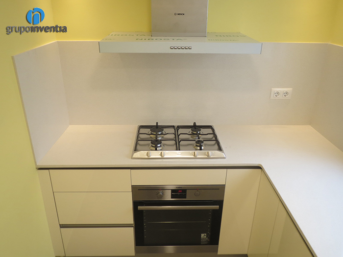 Centrándonos en el trabajo realizado en cada estancia, la reforma de cocina dejó a esta preparada y equipada para una correcta usabilidad. En la cocina, de alargada, se distribuyó el espacio en forma de L, consiguiendo que todos los elementos quedaran bien distribuidos sin renunciar al espacio. Al fondo, se colocó una cocina de cuatro fogones coronada por una campana extractora y en la parte de la derecha, se instaló un fregadero doble. Con esta distribución, la encimera restante es muy amplia y perfecta para realizar cualquier tarea de cocina, además, debajo de ella se ha instalado un mueble de cocina con cajones y armarios destinados al almacenamiento.