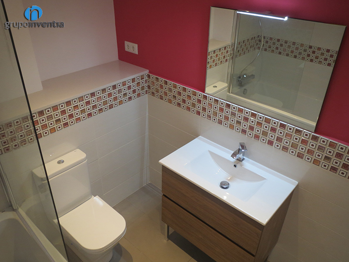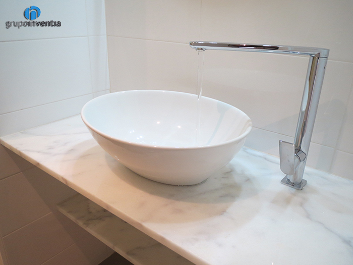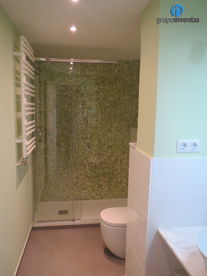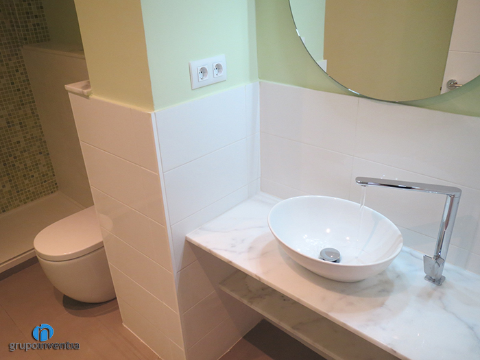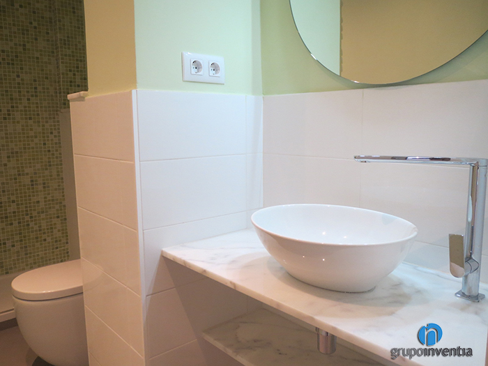 En cuanto a la reforma de baños, el principal ha sido equipado con nuevas piezas sanitarias como un lavabo de diseño ovalado sobre una repisa de mármol, un inodoro y un plato de ducha en el fondo de la estancia. A parte de todo el mobiliario instalado, también destaca el color utilizado para pintar las paredes. En este caso se combinó el blanco, de los azulejos colocados hasta media altura, y el verde, color del que se pintó la pared restante y utilizado en el mosaico que adorna la pared de la ducha.