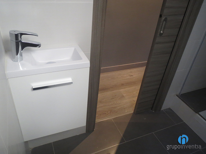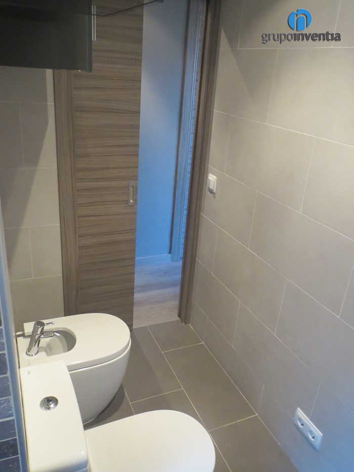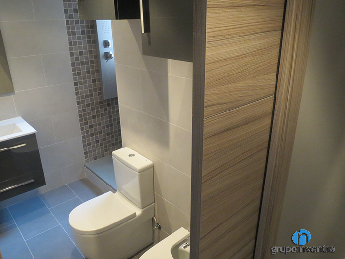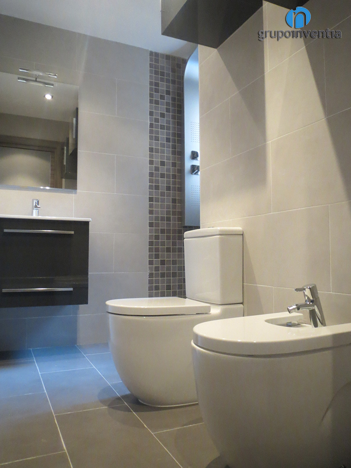 Para la reforma de cuarto de baño se optó por las piezas sanitarias clásicas. Un inodoro junto a un bidet y un lavabo con armario incorporado y un espejo en la parte superior. La ducha ocupa un espacio aparte, por lo que aumenta más la comodidad a la hora de realizar tareas de limpieza. Para cubrir las paredes se utilizaron azulejos beige y para el suelo gres gris, colores que combinan muy bien y otorgan al baño una sensación de calidez que lo hace más acogedor.