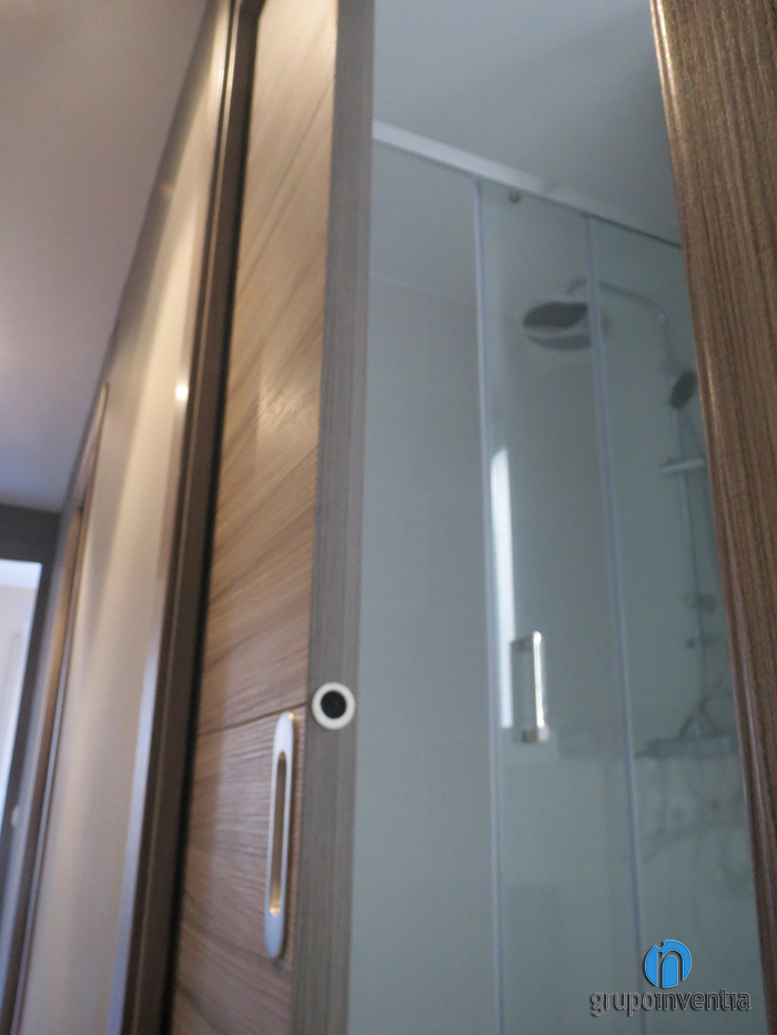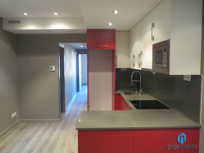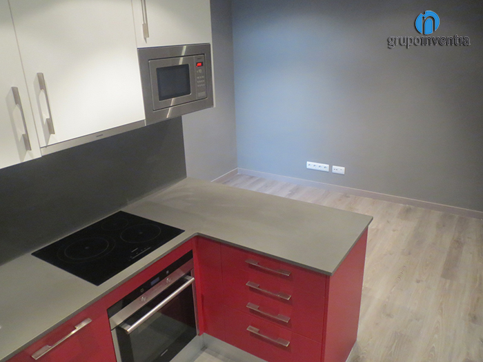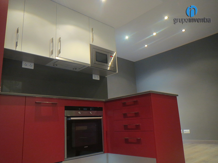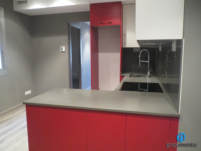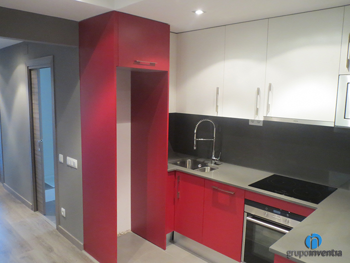Por otra parte, la cocina está integrada en el mismo espacio que la sala principal, por lo que lo más prioritario fue diferéncialos. Eso se consiguió instalando una cocina tipo office con una barra americana incorporada. La cocina se equipó con todos los electrodoméstico necesarios para una correcta habitabilidad y además, se colocó un mueble que cuenta con varios cajones y armarios. Pero lo que consiguió una clara diferenciación de espacios fue el color escogido para la parte baja del mueble de la cocina. Se optó por el rojo, un tono que sin duda permite delimitar el espacio propio de la cocina.
