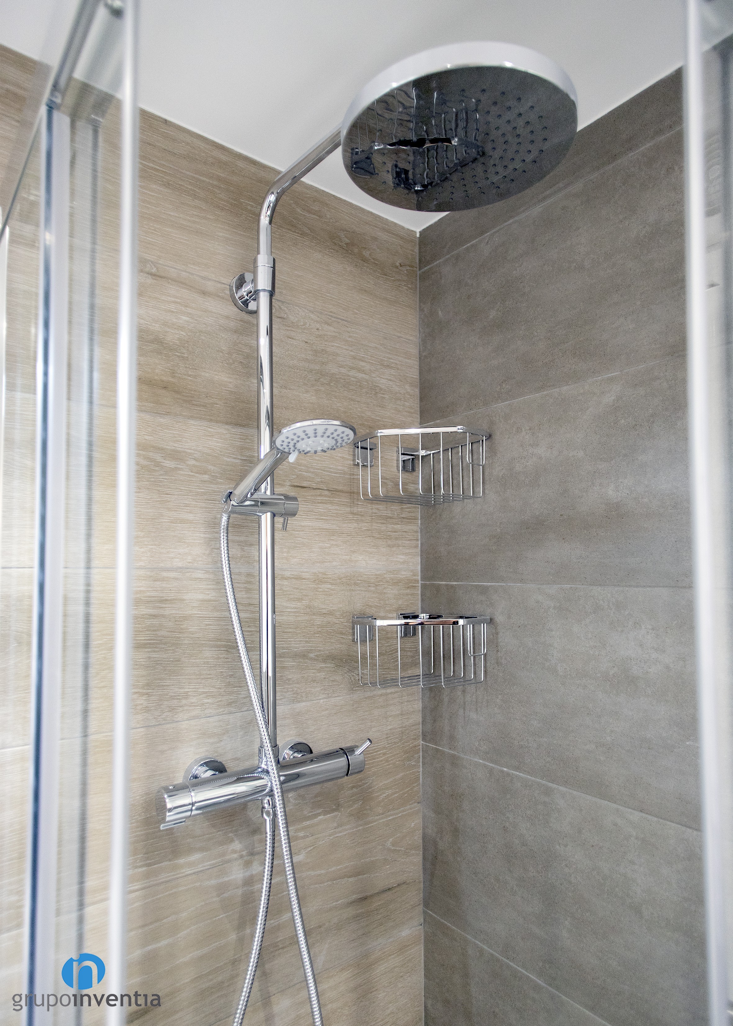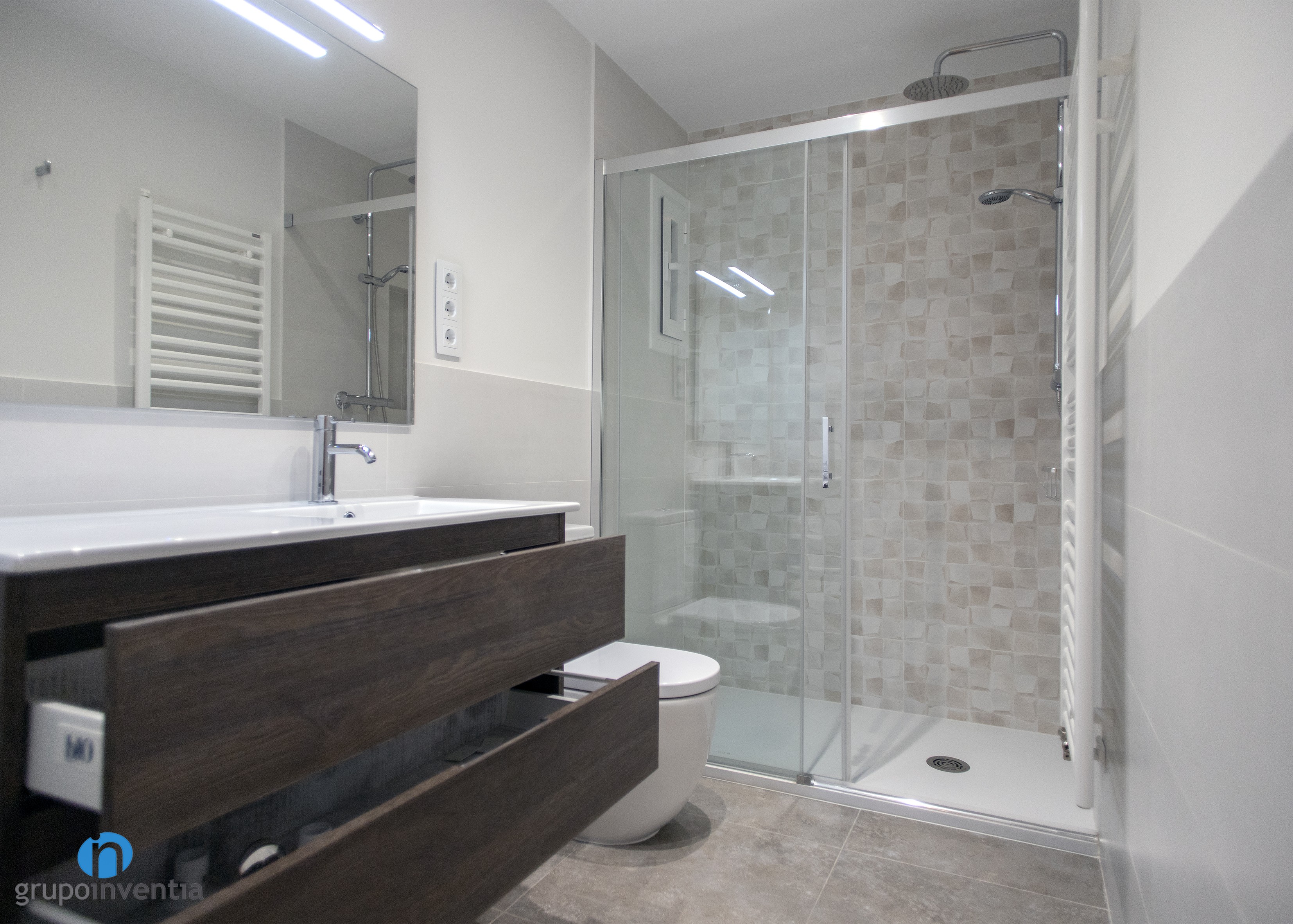 Tras el trabajo de reforma e interiorismo, los cuartos de baño lucen una imagen perfecta y disponen de un equipamiento sanitario completo y que ofrece las mejores prestaciones y funcionalidad en su uso. Éste se compone de un lavabo con mueble de almacenaje incorporado, un inodoro y una cómoda ducha protegida con mamparas de puertas correderas transparentes.