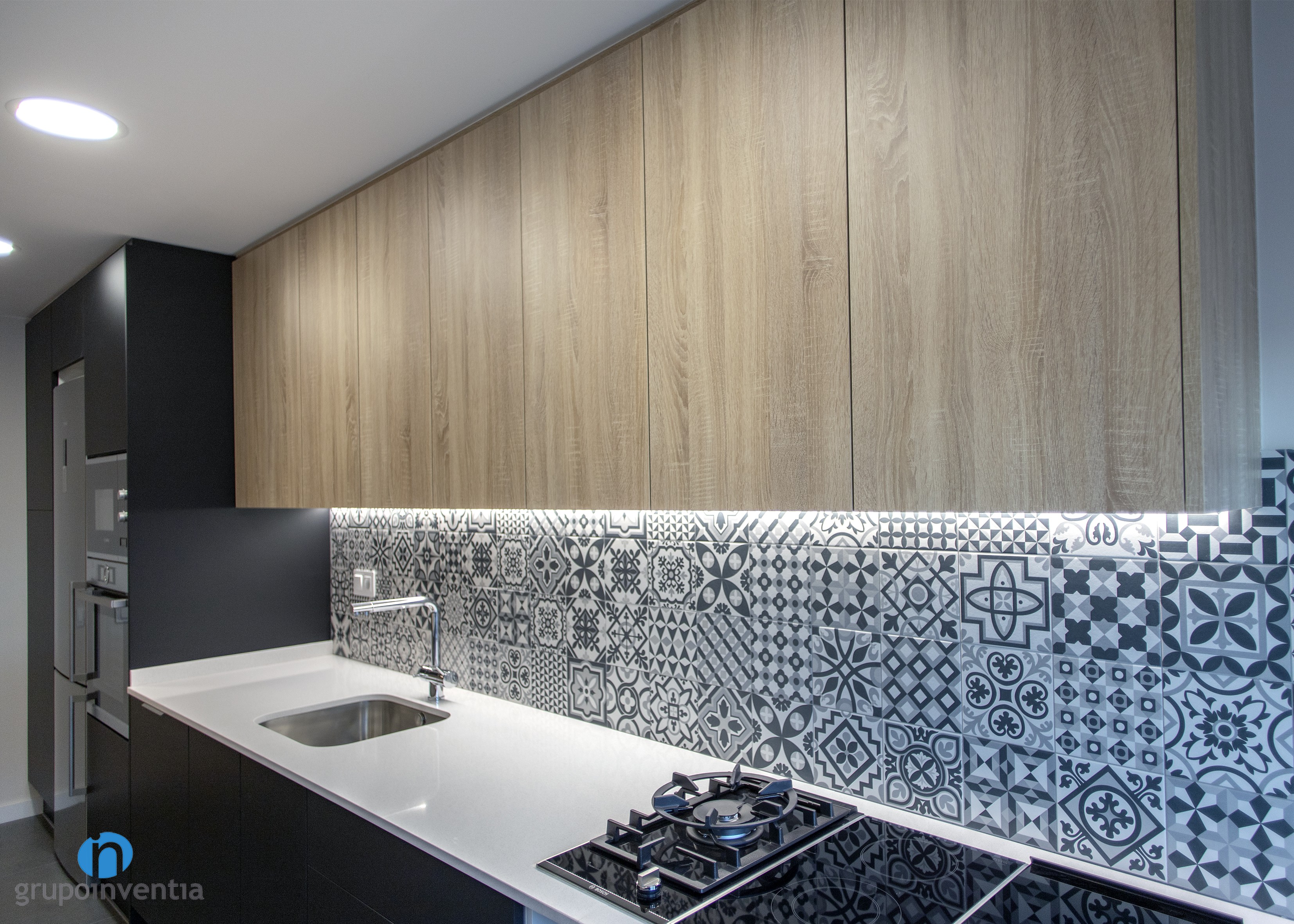 Seguidamente nace una alargada encimera que llega hasta el otro extremo de la cocina. Sobre esta se instalaron un fregadero individual y una placa de cocción que mezcla fogones y placa vitrocerámica. Tanto en la parte superior como inferior del mueble de cocina hay cajones y armarios que ofrecen una amplia capacidad de almacenaje.