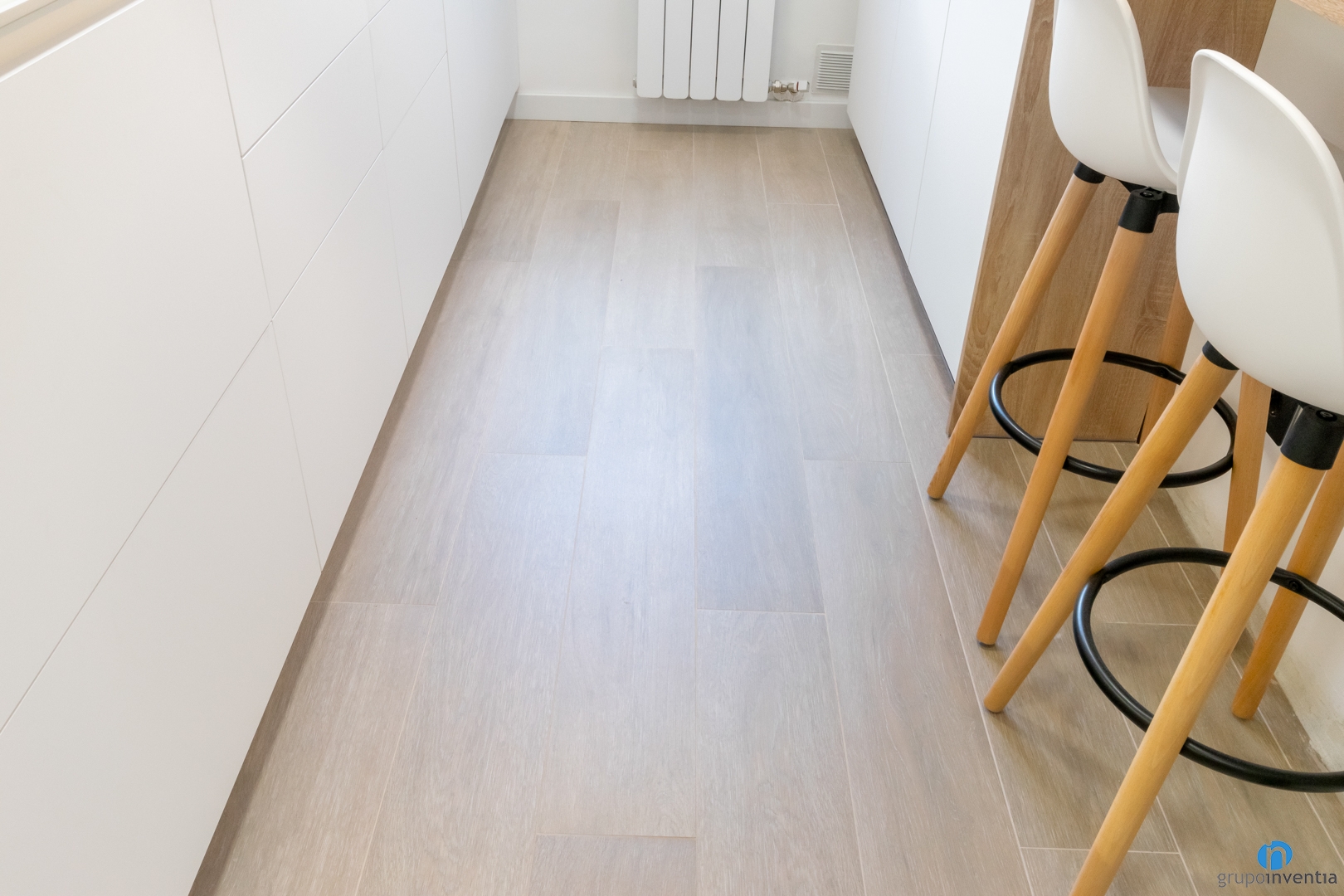 Esta imagen neutra y agradable la hemos potenciado con el nuevo suelo de cocina. Se trata de un pavimento cerámico con un acabado que imita el parquet. A nivel visual es excelente y encaja de maravilla con los otros elementos de madera. En la parte práctica se trata de un suelo fácil de limpiar y mantener, ideal para un espacio como las cocinas.