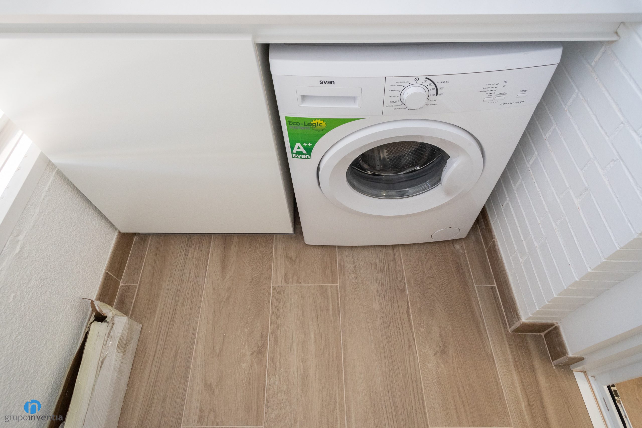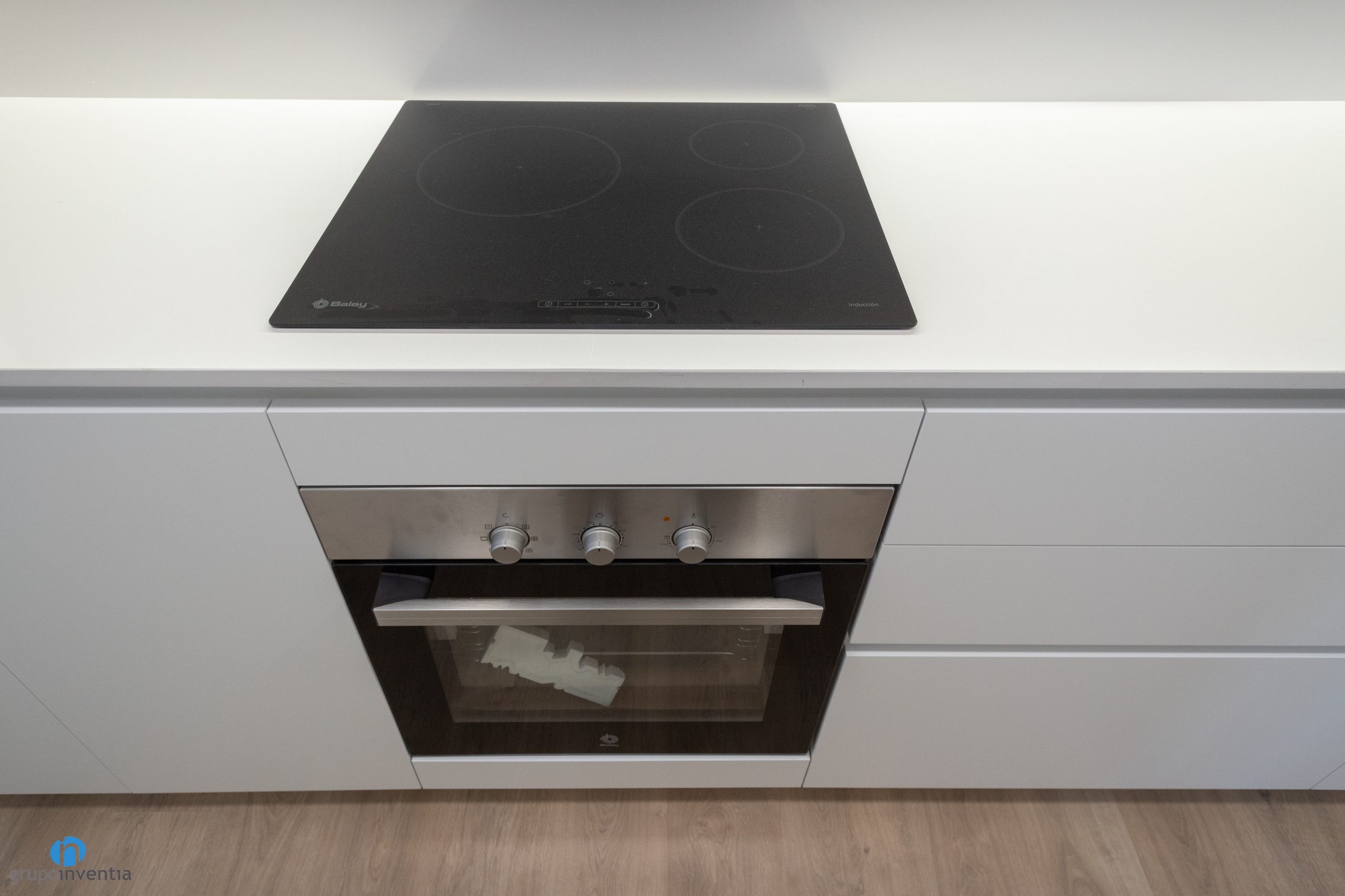 Del mismo modo que se ha cambiado la distribución del espacio, esta reforma de cocina también se ha equipado por completo. Ahora cuenta con electrodomésticos de primeras marcas y que garantizan las mejores prestaciones. Los electrodomésticos se integran en el nuevo mueble de cocina (hablaremos de él más adelante) para no restar espacio físico a la cocina. De este modo el horno se integra en la parte inferior del mueble de cocina y el microondas hace lo propio en la zona superior.