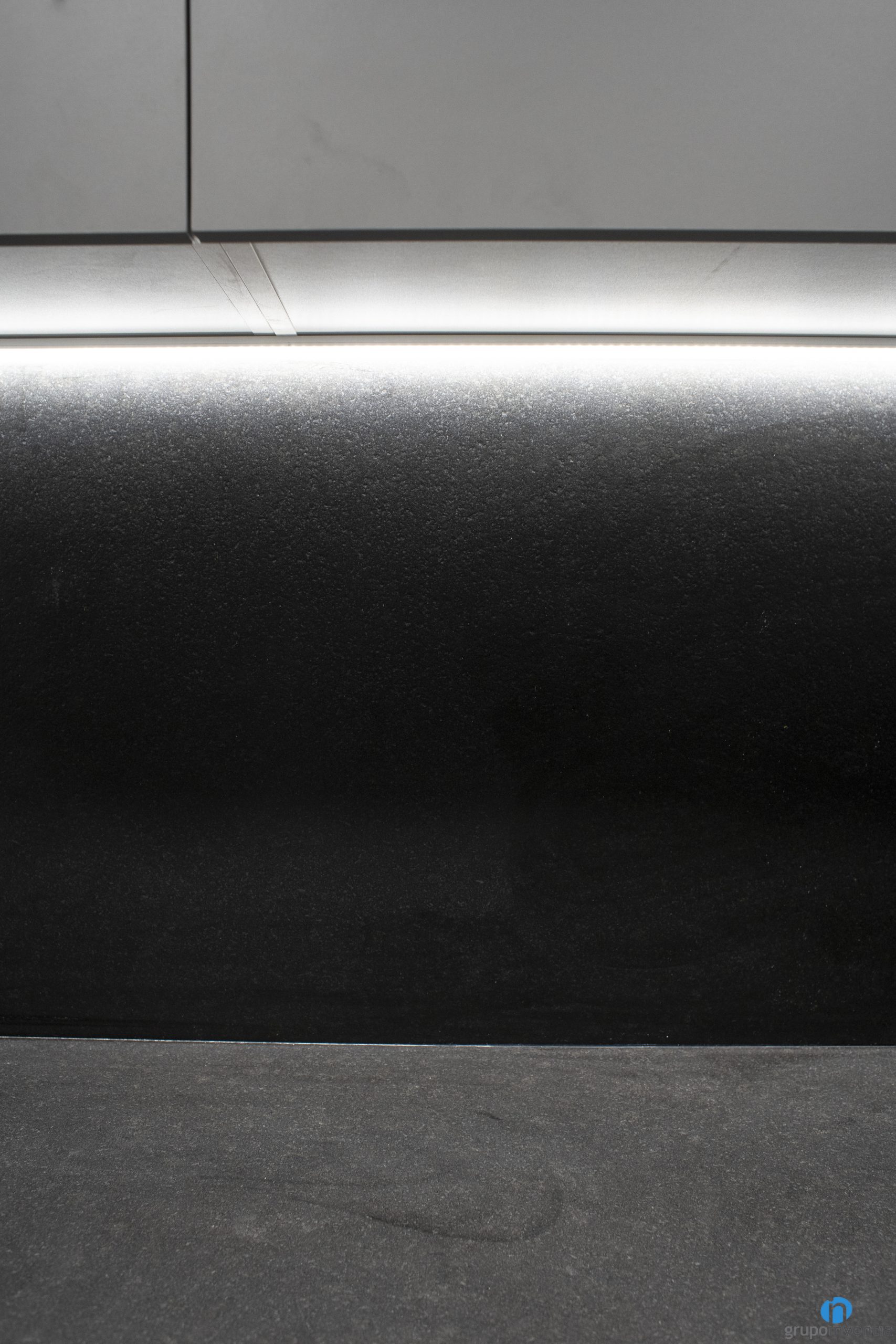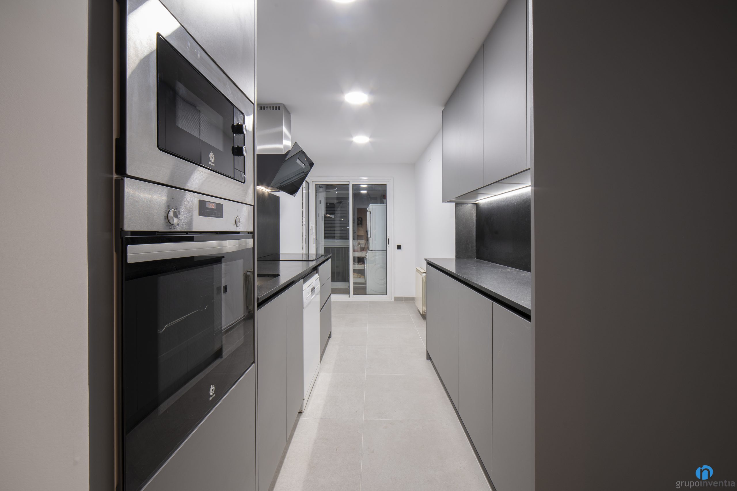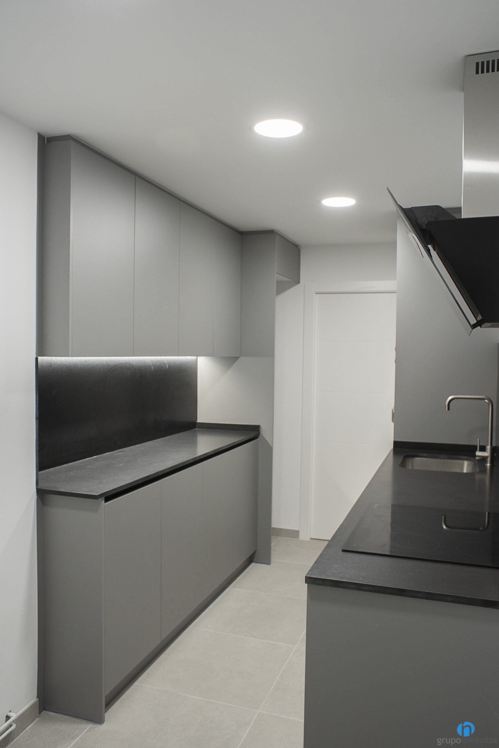 El mueble de cocina gris se combina con unas encimeras de color negro. Como resultado hemos obtenido un diseño de cocina muy elegante y contemporáneo. El resto de paredes de la cocina se han pintado de color blanco. Así hemos conseguido potenciar al máximo la sensación de luminosidad y amplitud visual.