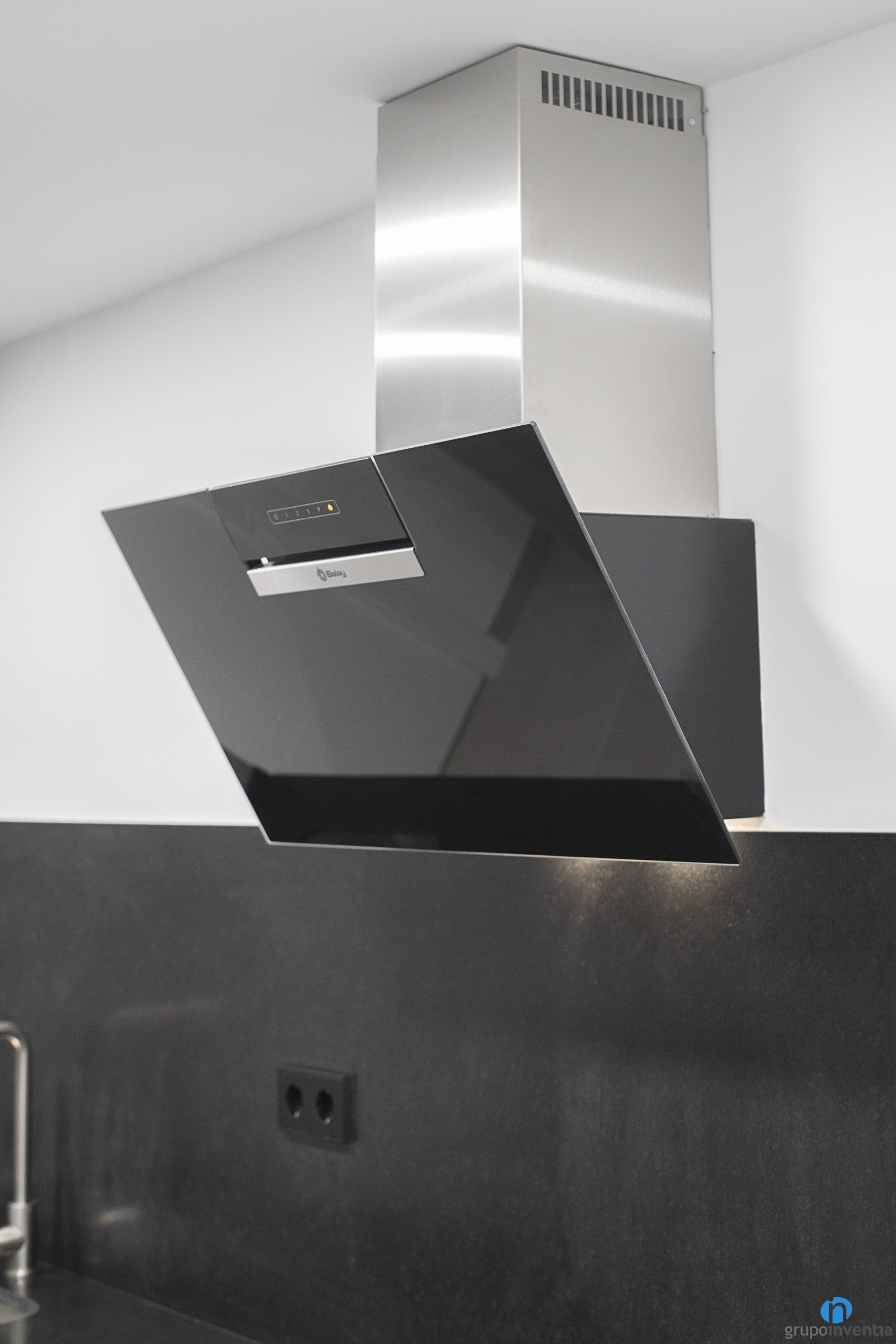 Por su parte en la encimera del lado derecho se han instalado más electrodomésticos. Se trata de un fregadero de un seno y de una placa vitrocerámica acompañada de una campana extractora de diseño. En la parte inferior de la encimera, además de disponer de armarios para el almacenaje, también se ha integrado un lavavajillas.