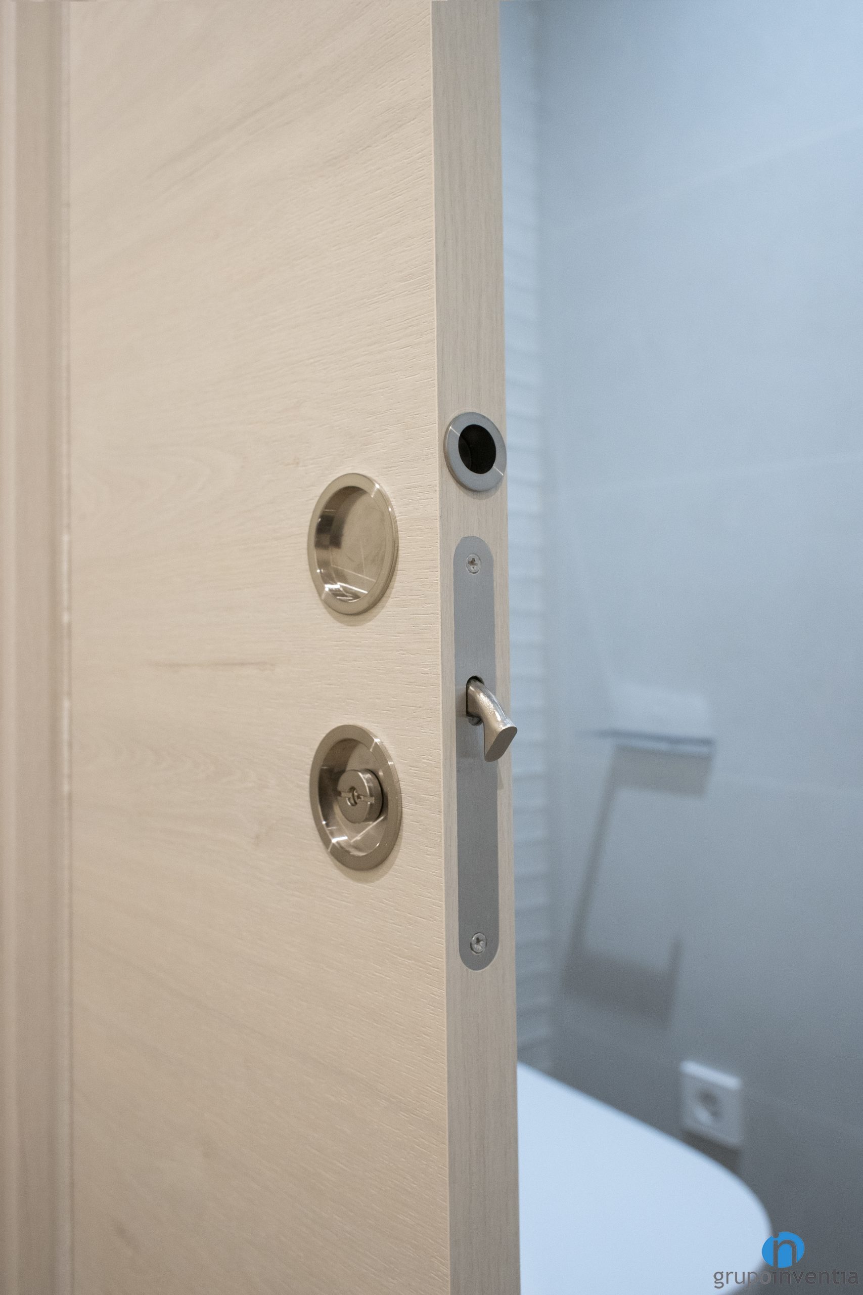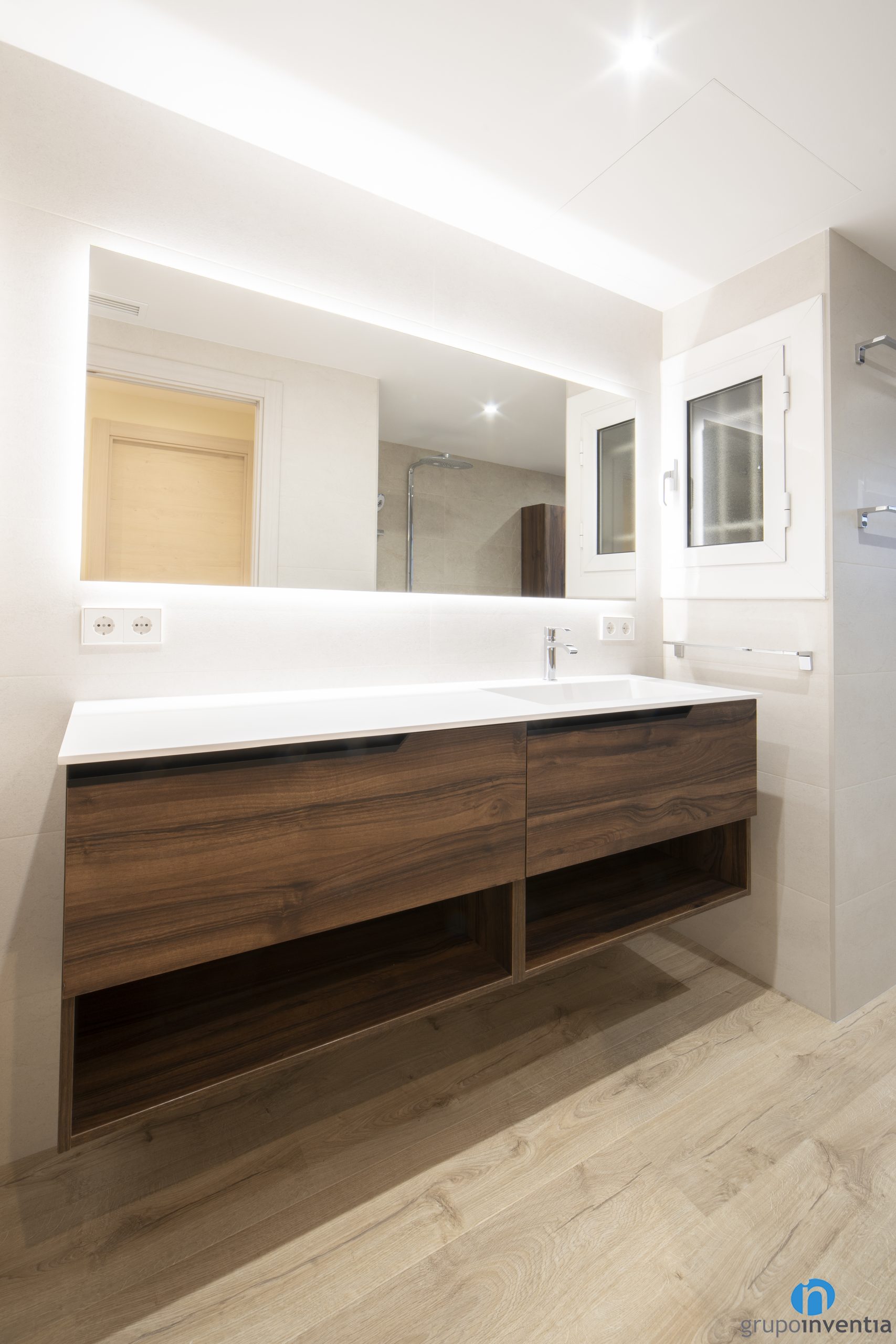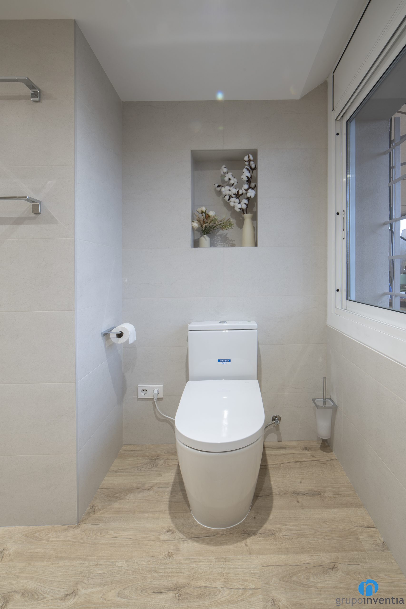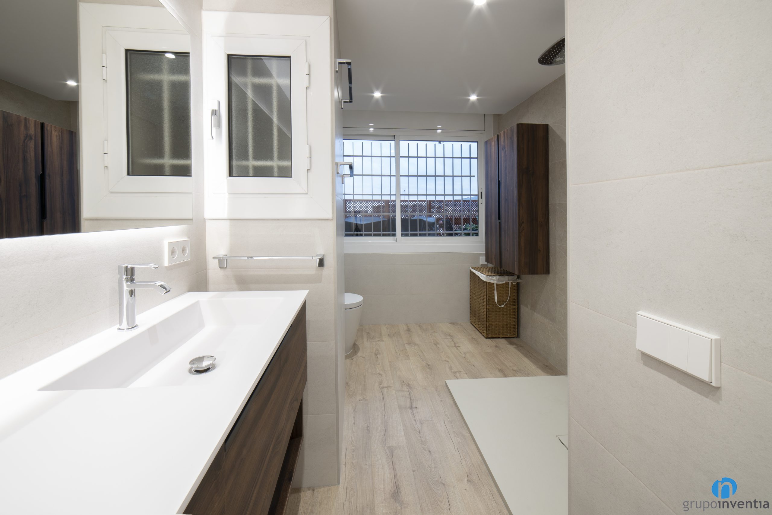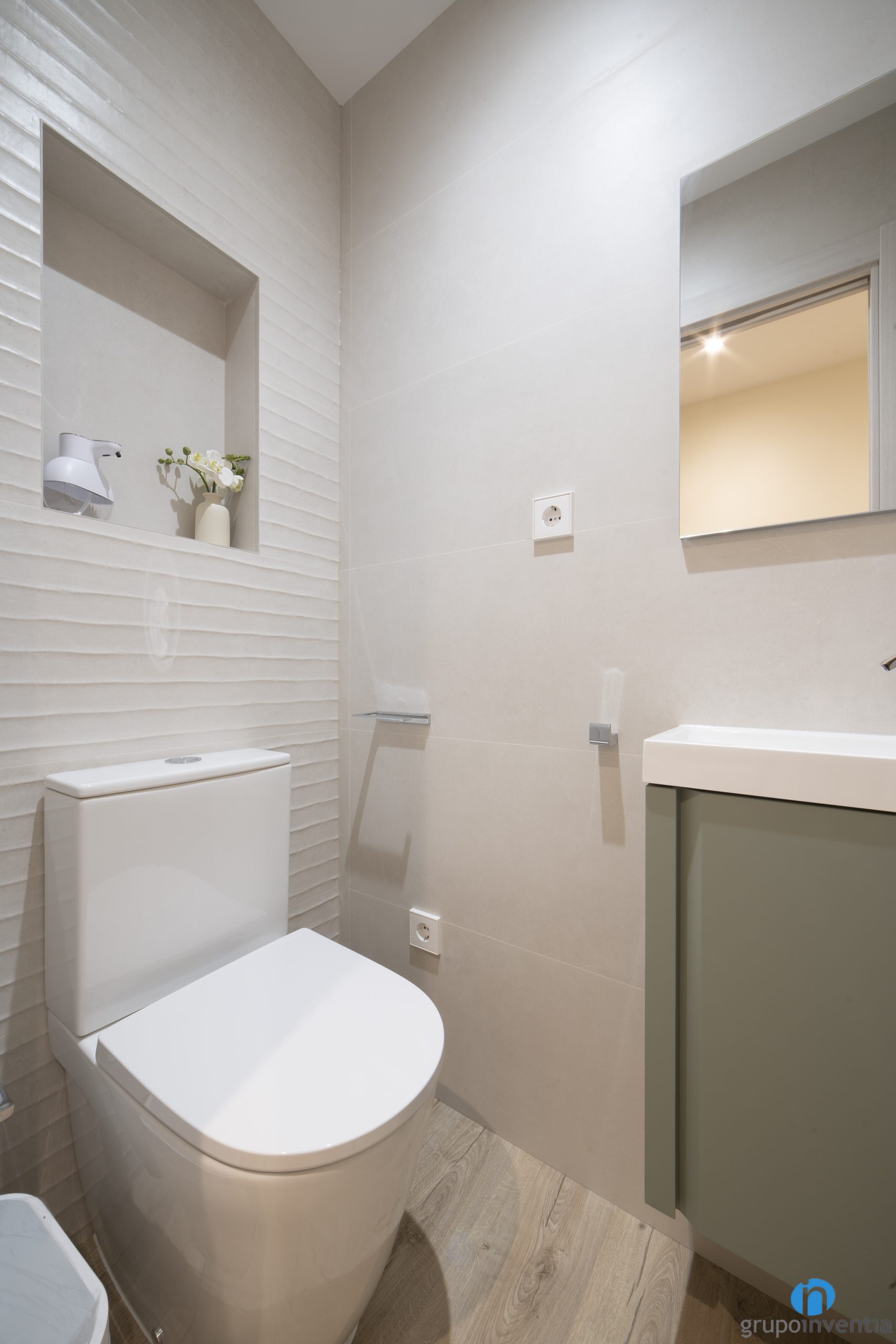 Por otro lado encontramos un aseo al que se accede por una puerta corredera. Funciona como un espacio de aseo complementario y cuenta con un lavabo con mueble incorporado y con un inodoro. En ambos reformas hemos apostado por un diseño de baño en todos neutros con el objetivo de conseguir dos espacios agradables y frescos.