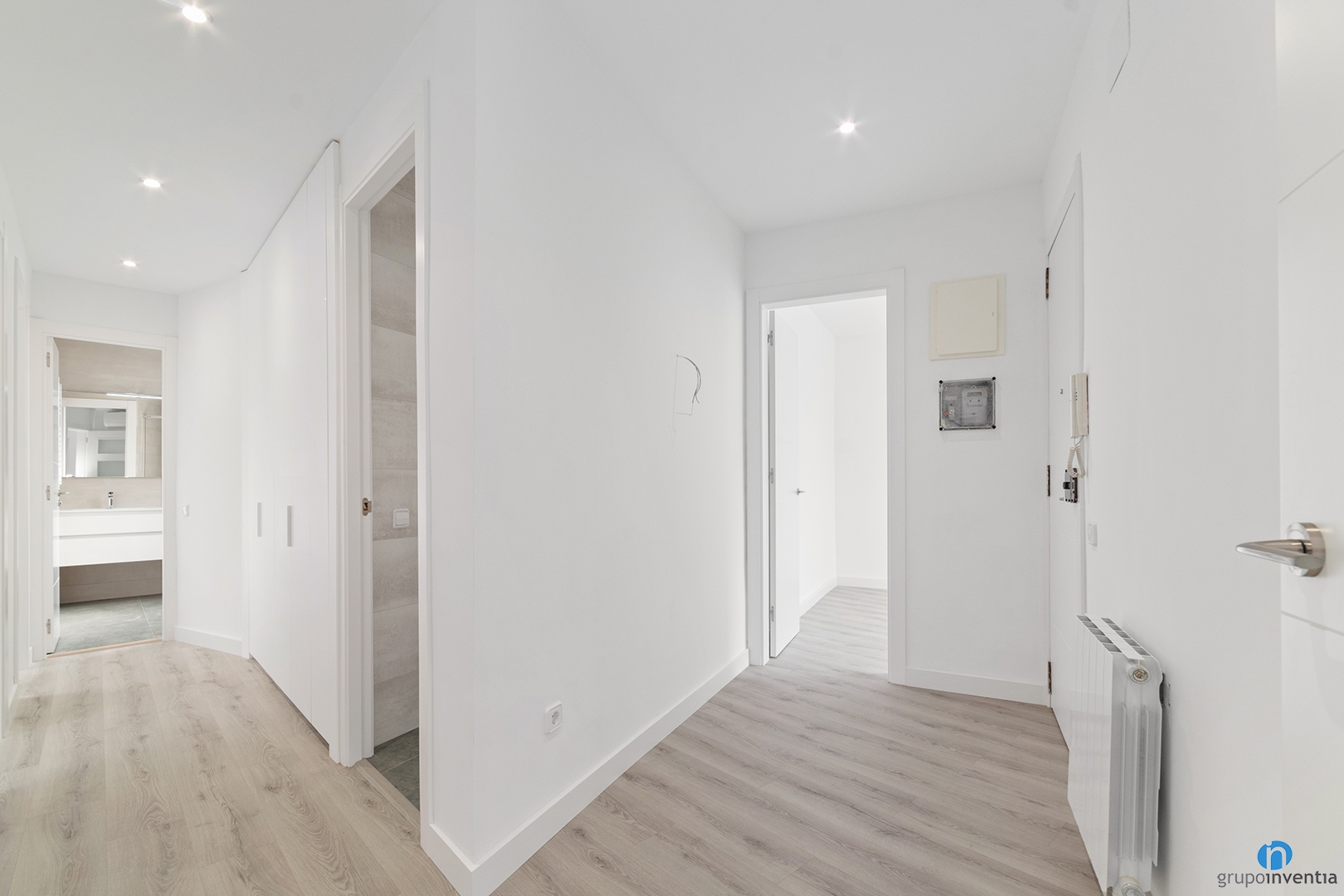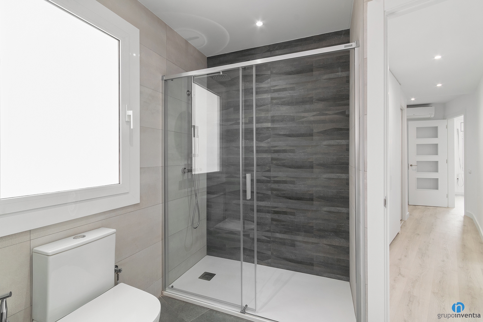 Al final del pasillo nos encontramos el nuevo cuarto de baño. Es amplio y cuenta con un equipamiento sanitario completo. Nos hemos encargado de instalar un plato de ducha, un inodoro con suple bidet y un lavabo con mueble de dos cajones. Se trata de un espacio de aseo listo para ofrecer las mejores prestaciones.