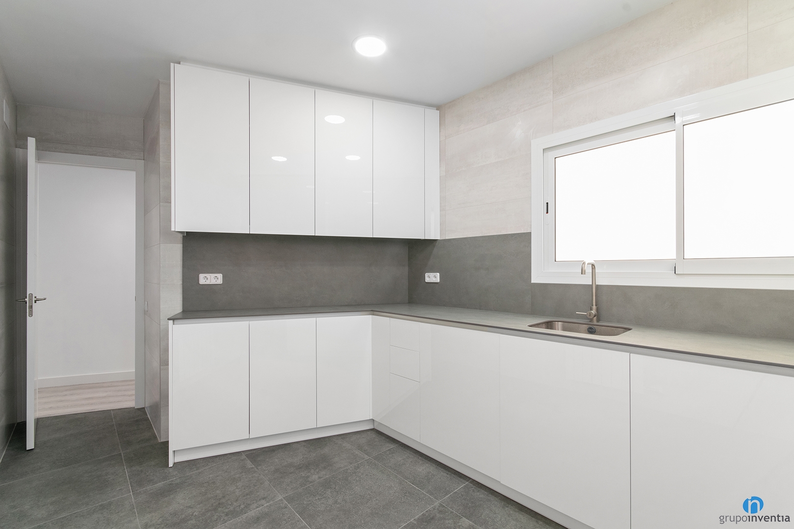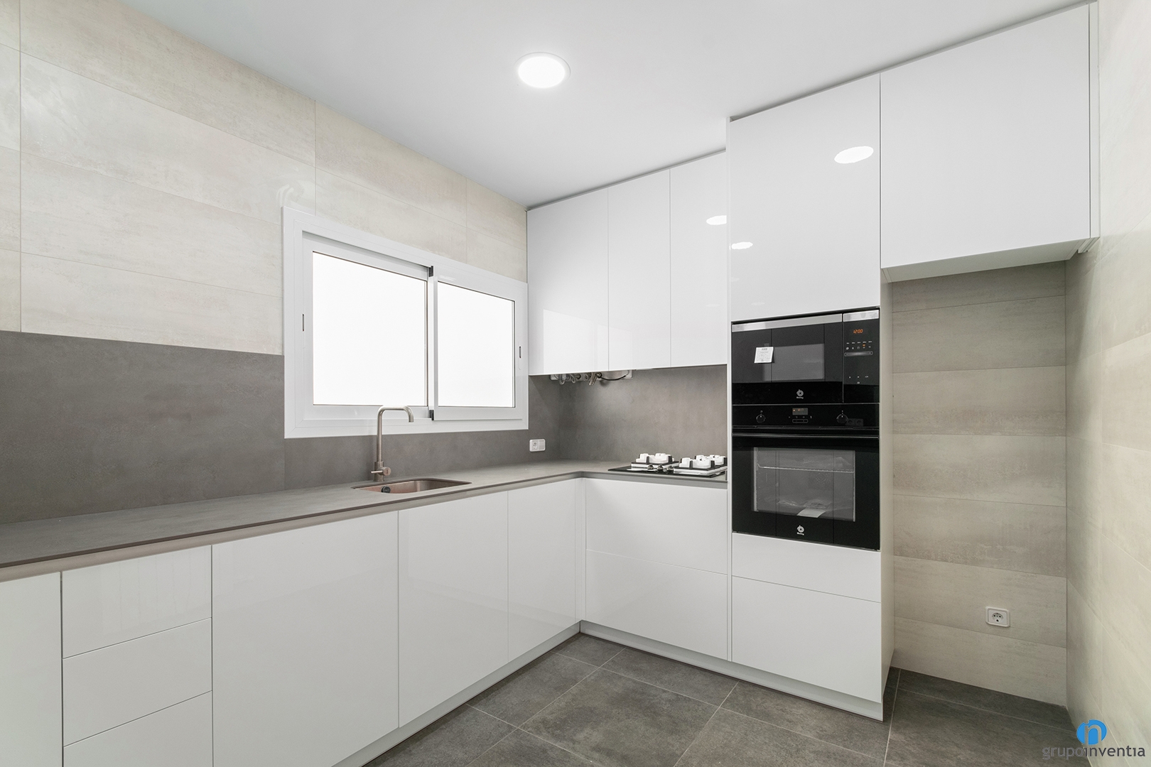 La cocina se ubica en una espacio propio y amplio. Tiene una distribución en forma de U y cada elementos queda ubicado en el lugar más funcional. El primer tramo de encimera está destinado a superficie de trabajo y de apoyo. A su vez, cuenta con capacidad de almacenaje tanto en la parte inferior como superior.