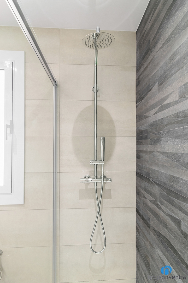 Además, en esta reforma de baño en Barcelona también hemos mejorado la imagen interior. Hemos alicatado las paredes con azulejos rectangulares de tono neutro. De este modo la luz natural que entra del exterior inunda todo el espacio. Esto se combina con un pavimento de tono gris y la pared decorativa de la ducha.