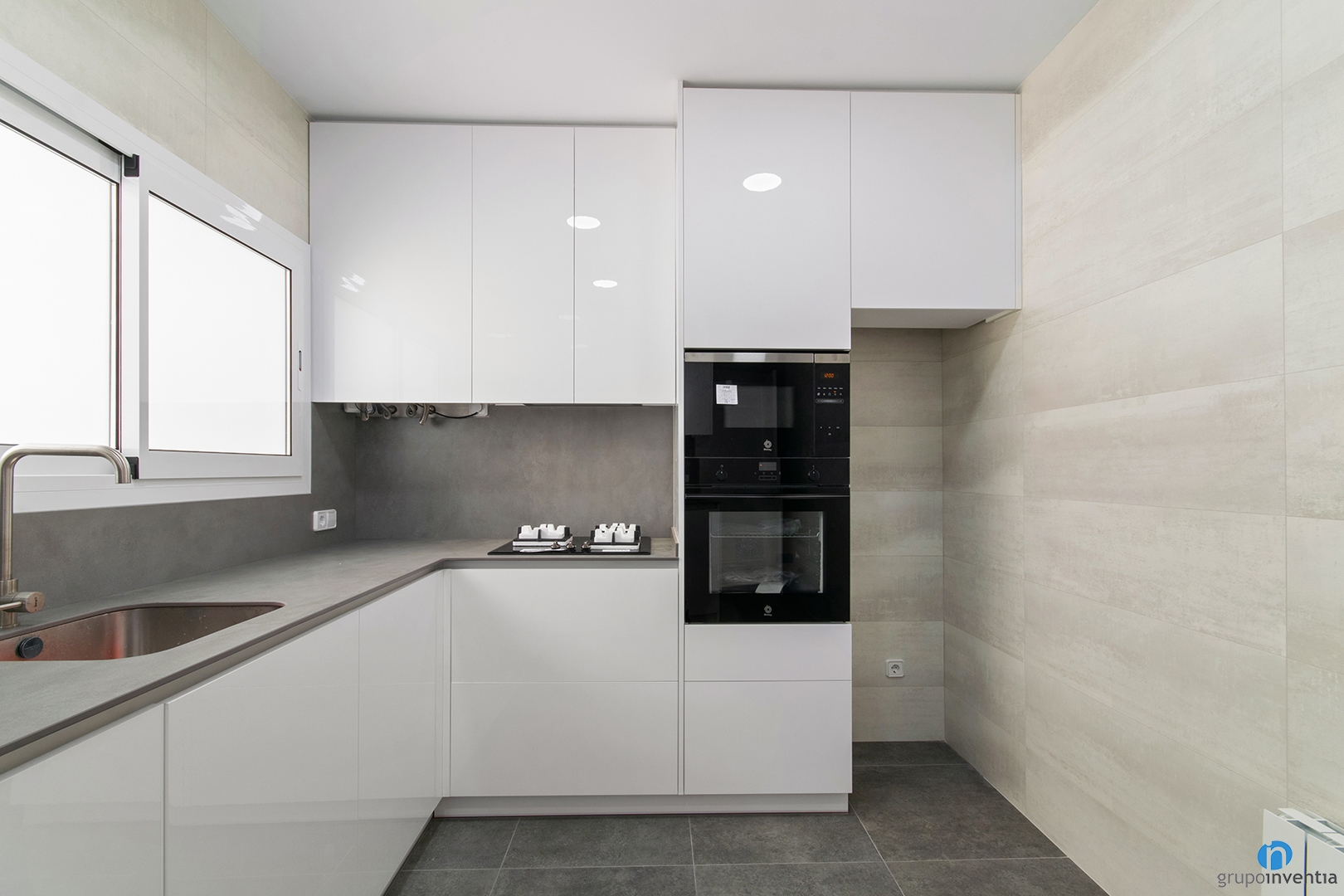 En esta reforma de cocina los electrodomésticos se integran en una columna. Nos hemos encargado de hacer huecos a medida para colocar la nevera, el horno y el microondas. Al ser las encimeras tan amplias, también hay espacio para colocar pequeños electrodomésticos. Todo ello envuelto por un diseño de cocina que combina el blanco y el gris.