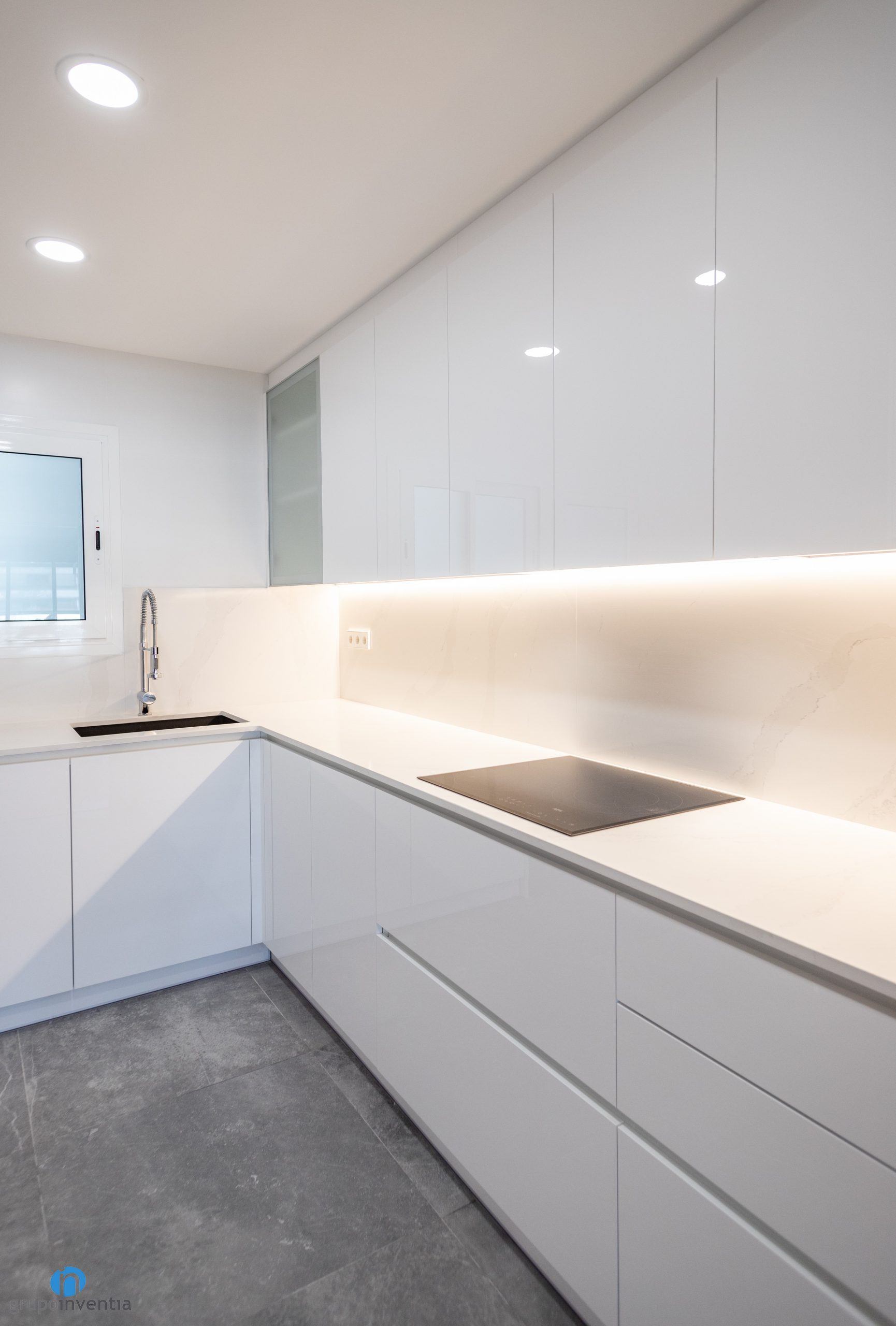 Una de las mejoras que ha traído esta reforma de cocina es la ampliación de la capacidad de almacenaje. Hay varios cajones y armarios tanto en la parte inferior como superior de las encimeras. Obviamente en estas últimas se ha instalado una placa de cocción y un fregadero, en este caso de un seno. Todo el mueble de cocina es blanco y se combina con un elegante suelo de baldosas grises.