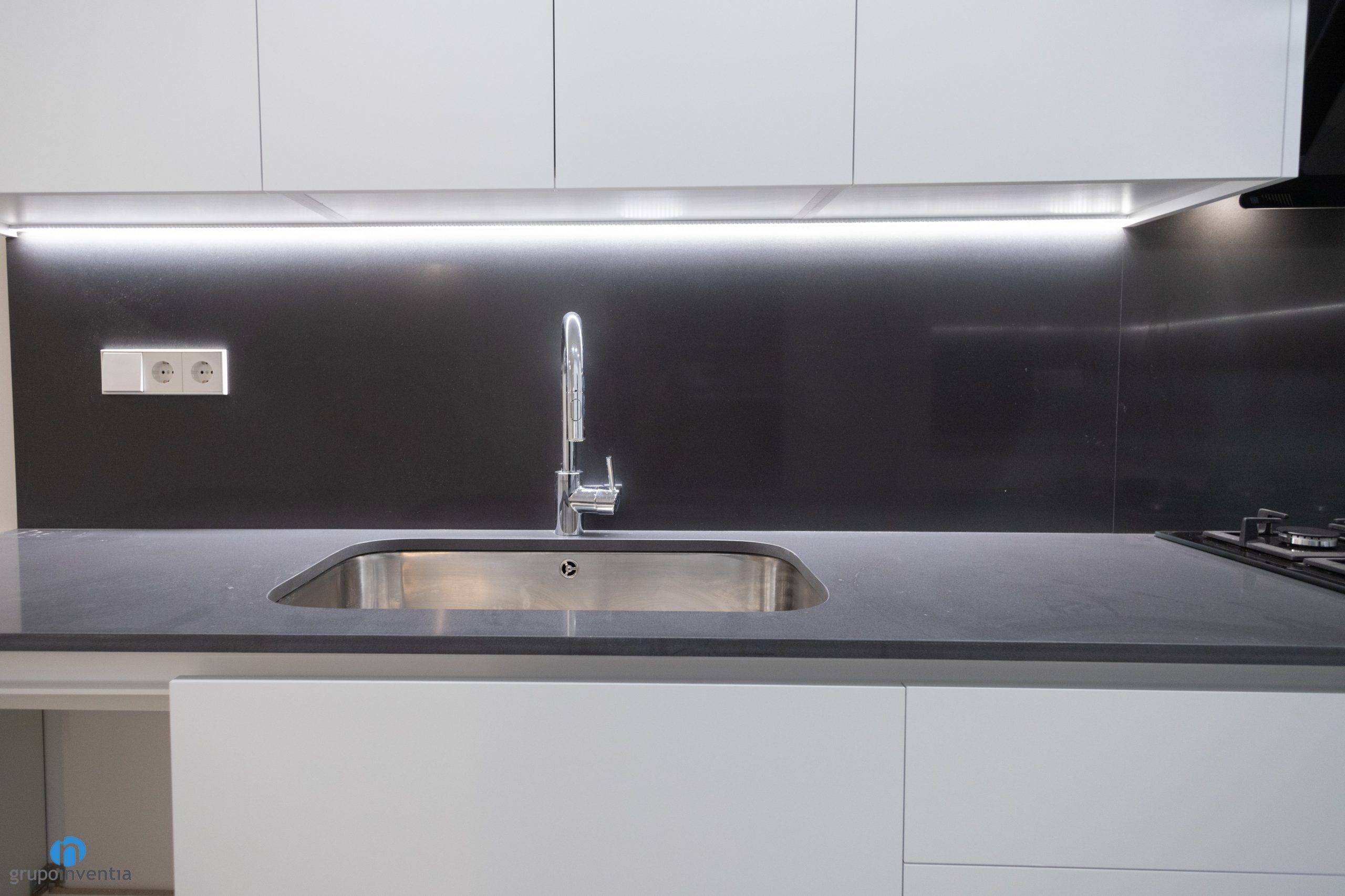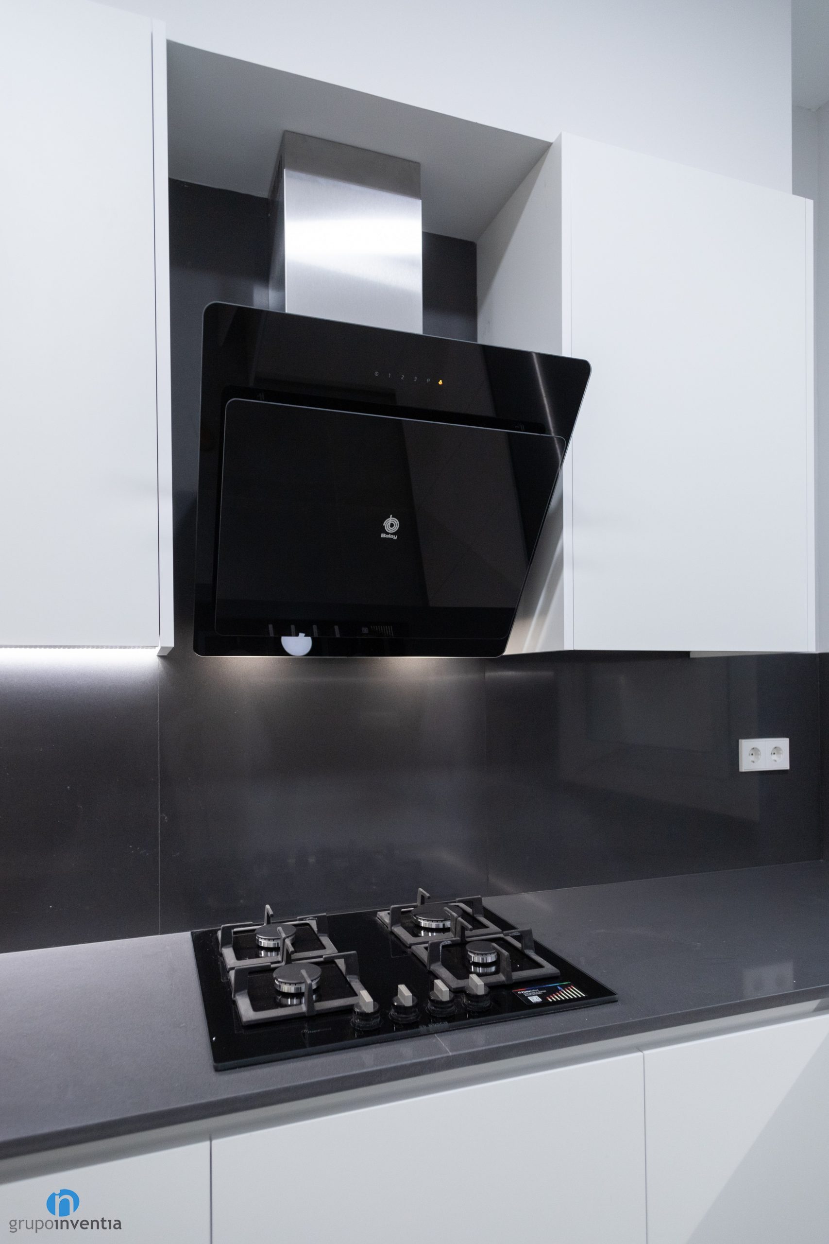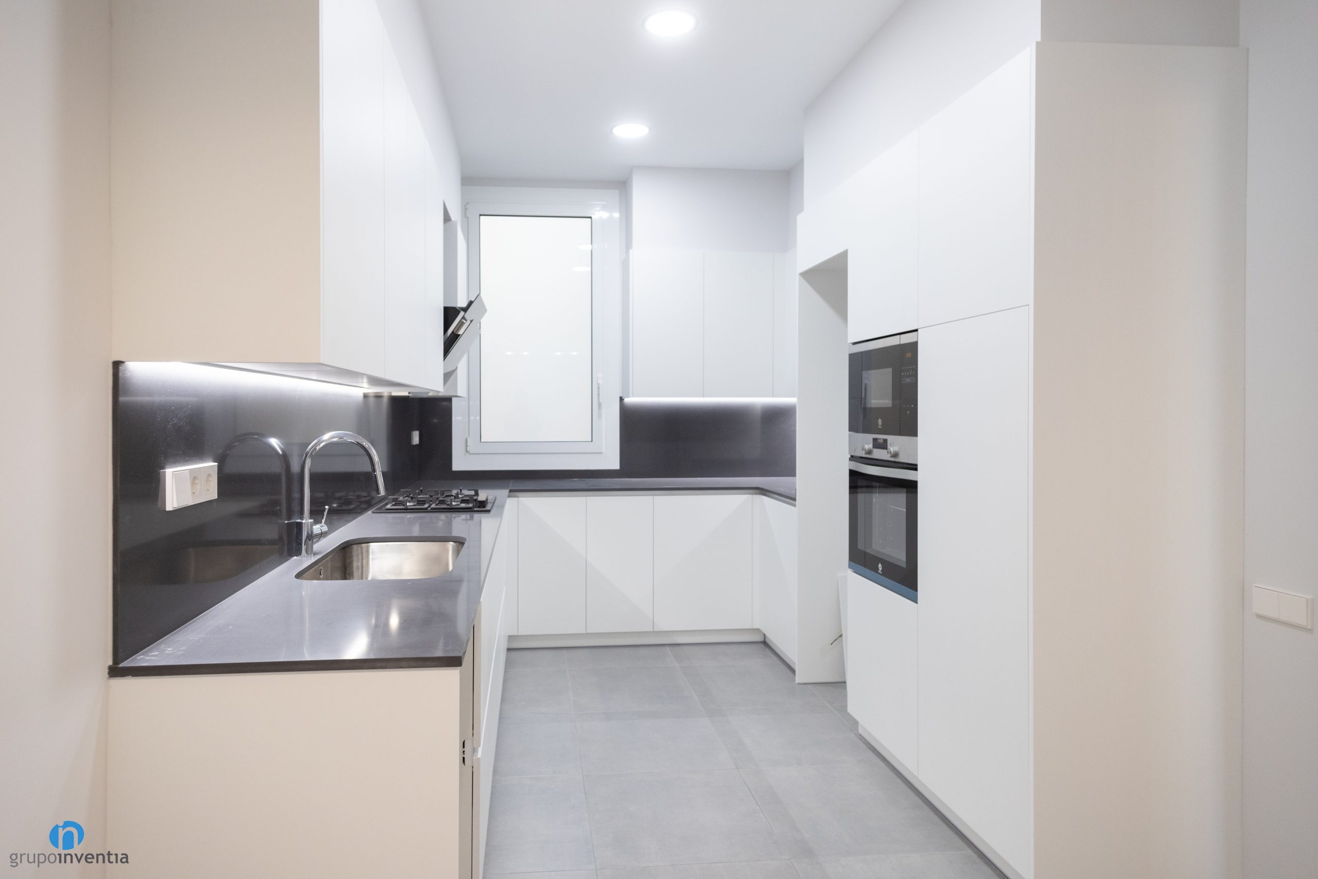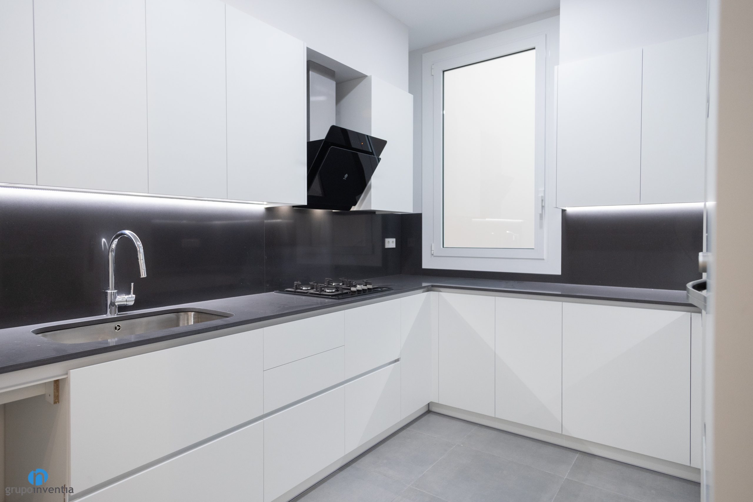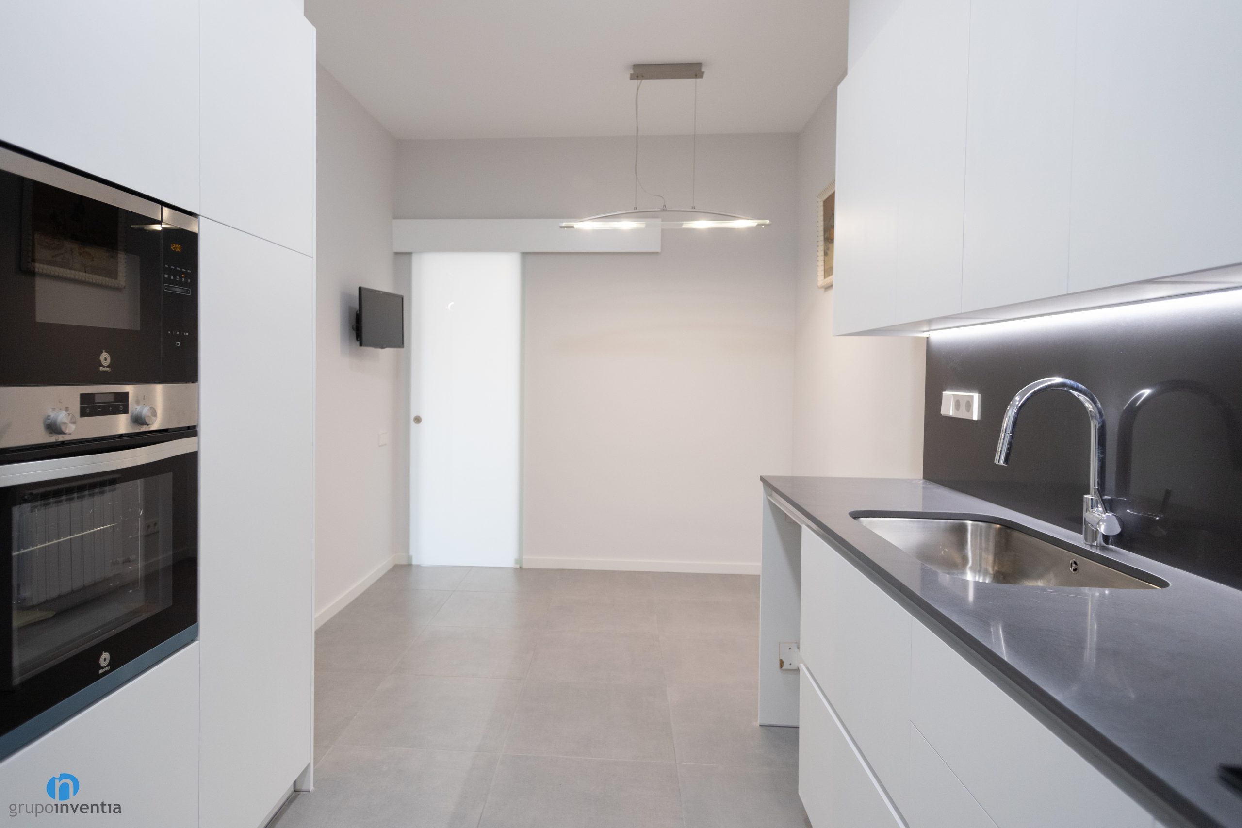 La cocina se ubica en una estancia independiente a la que se accede por una puerta corredera. Es una estancia amplia y se ha distribuido en forma de U. De este modo cada nuevo elemento queda situado en el lugar indicado para ofrecer la mejor funcionalidad. Además se ha ampliado la capacidad de almacenaje de la cocina. Tanto en la parte inferior como superior hay cajones y armarios que facilitan la organización de la estancia.