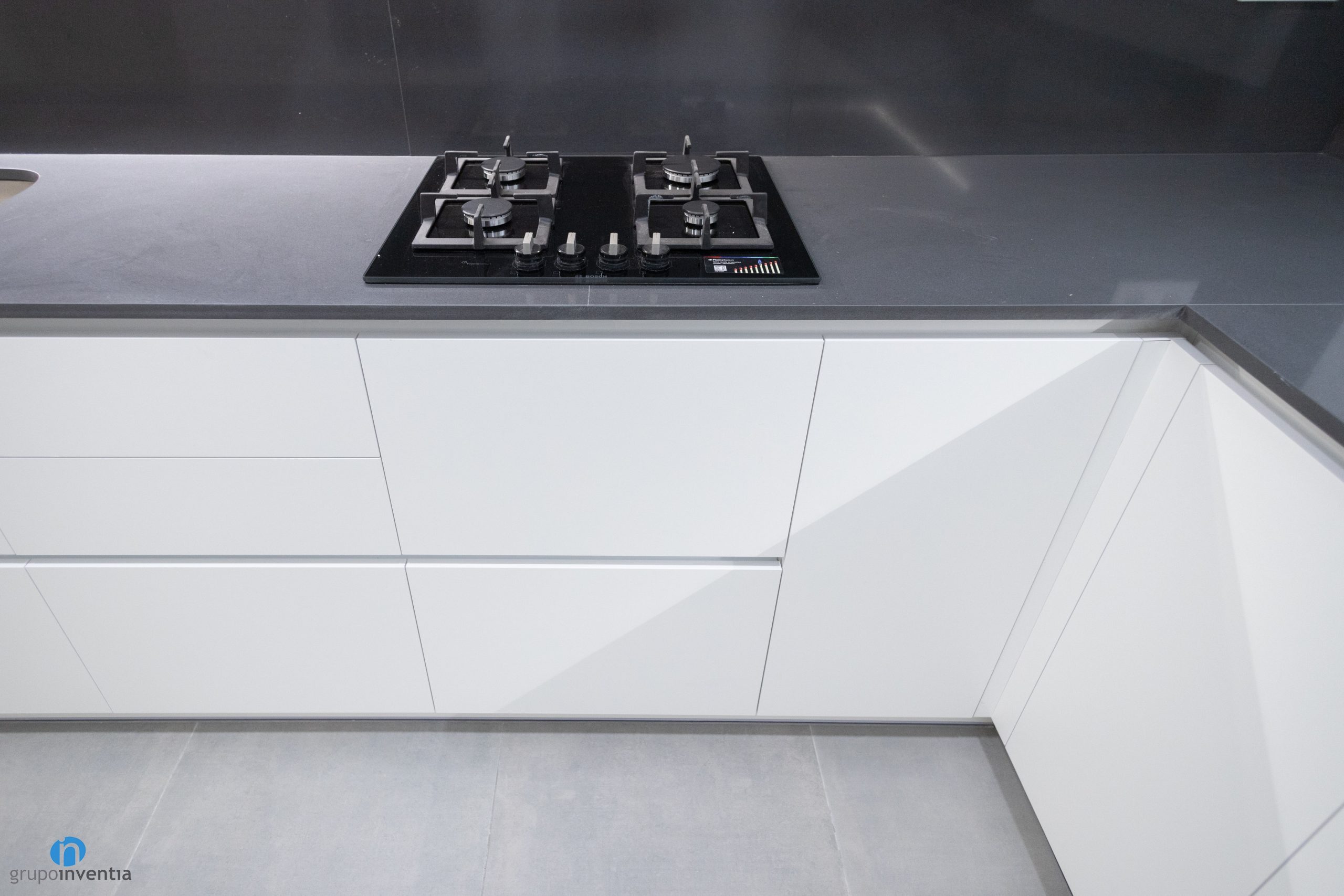 El lado izquierdo lo ocupa una encimera que se ha equipado con un fregadero y una placa de cocción de cuatro fogones. La encimera tuerce hacía la derecha y da paso a un segundo tramo destinado a superficie de apoyo. En el lado derecho se ha colocado un mueble de cocina con huecos a medida para integrar los electrodomésticos. Concretamente una nevera, un horno y un microondas.