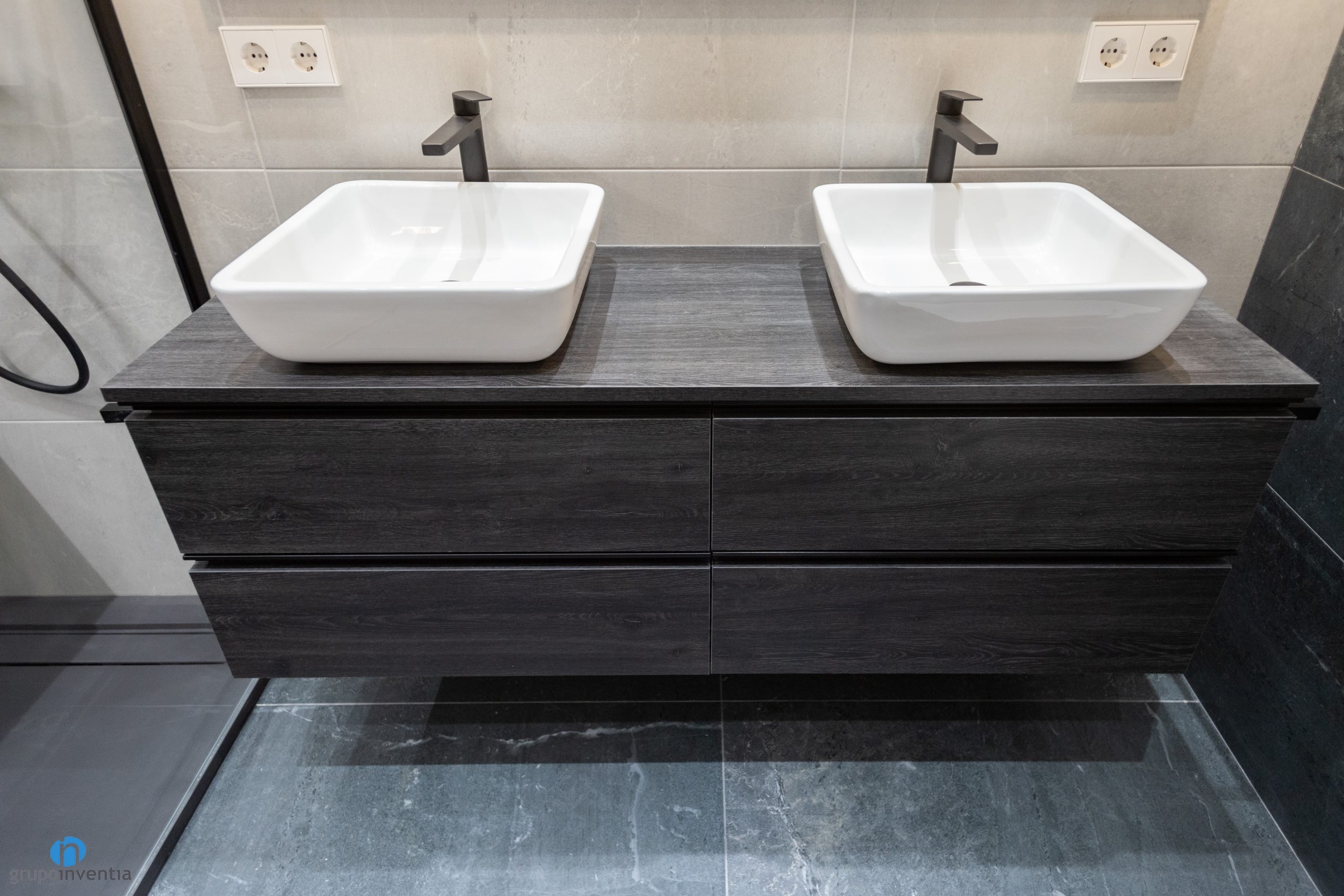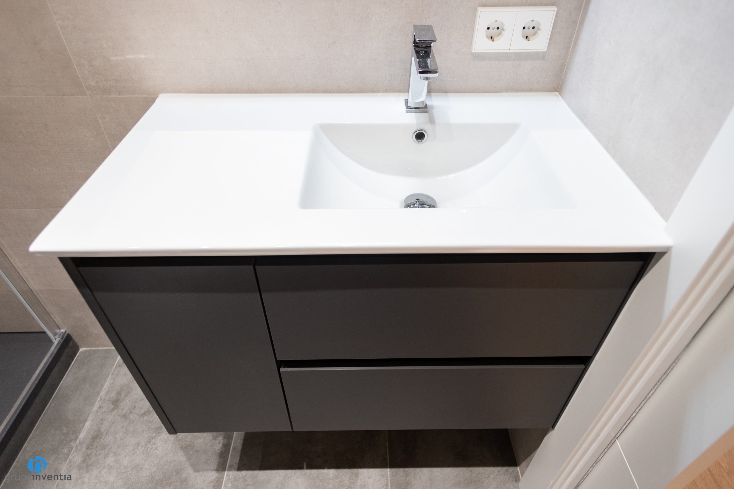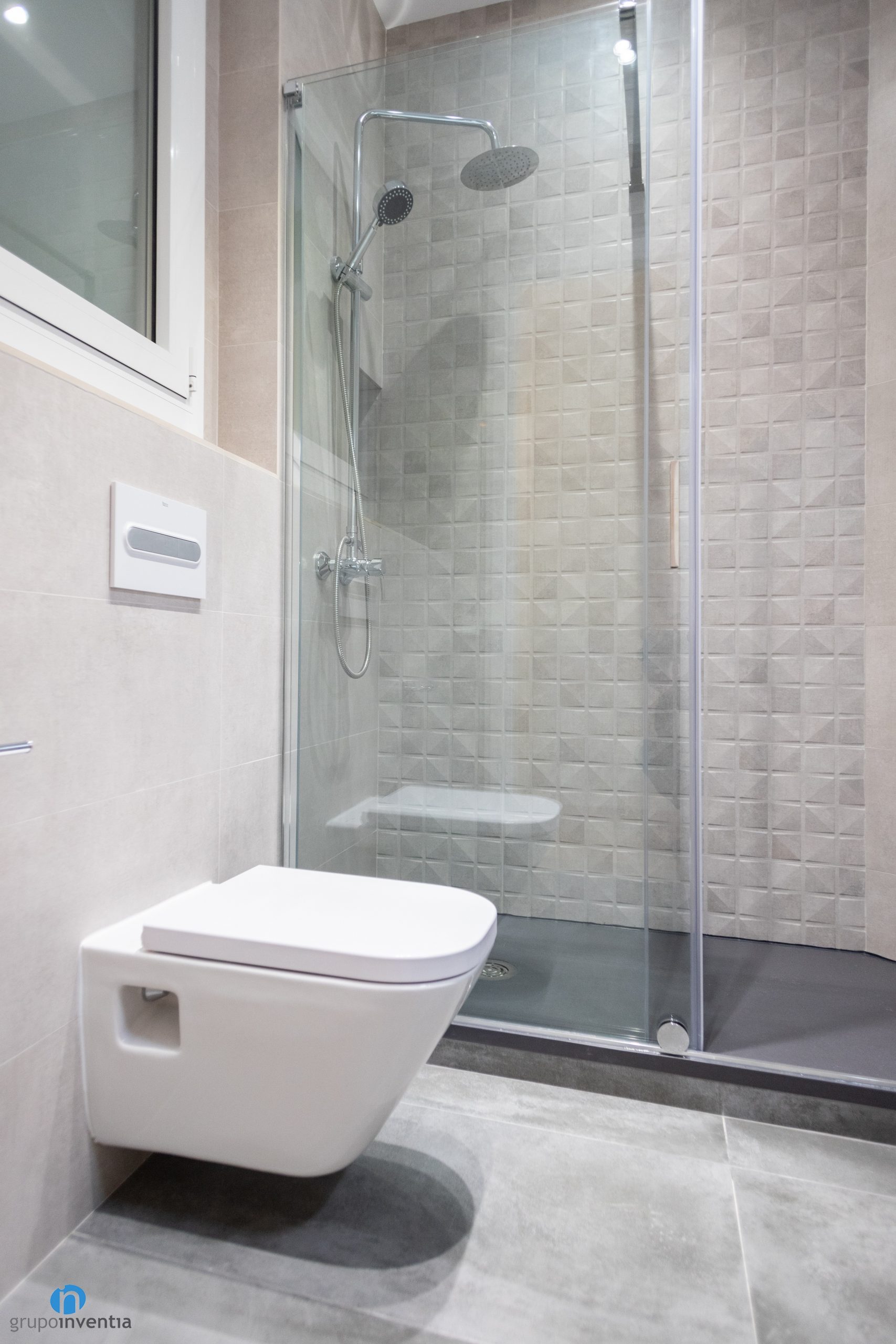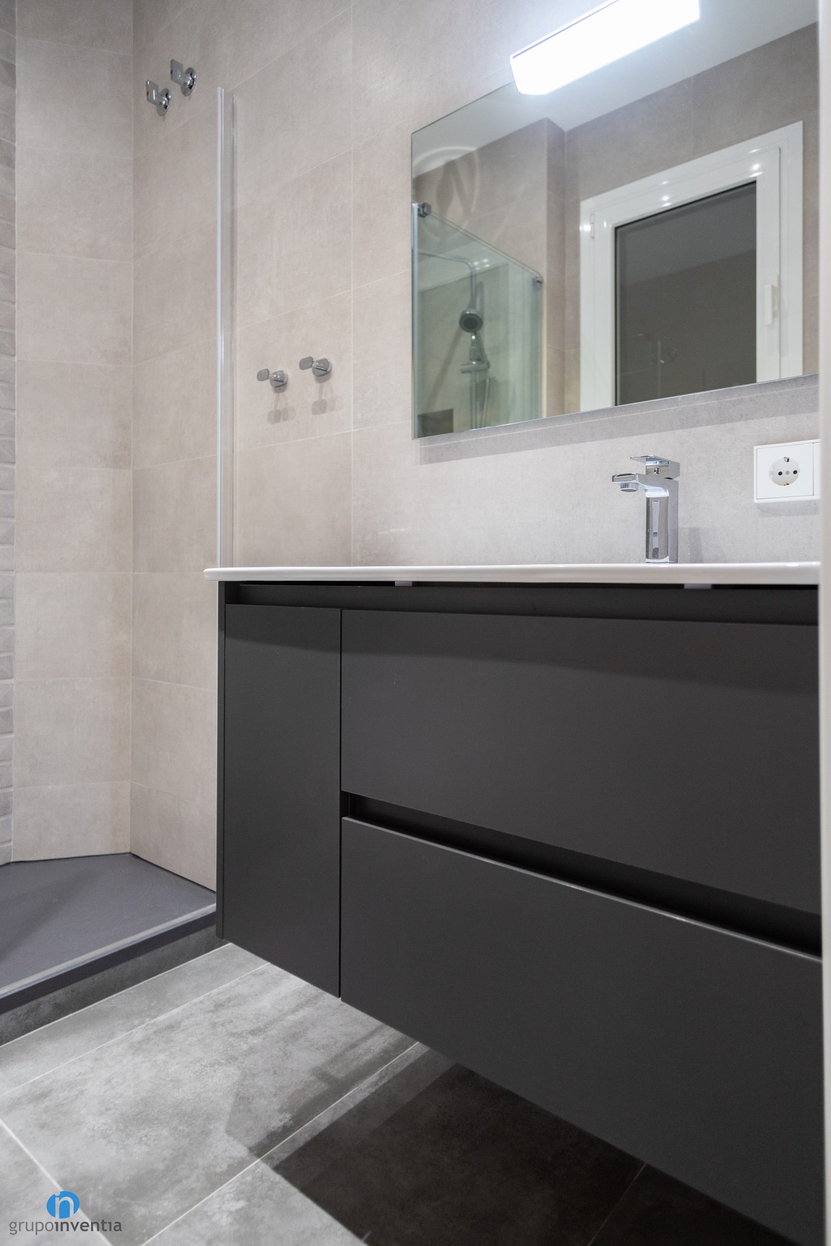Además del interiorismo también se ha renovado todo el equipamiento sanitario. Ahora cada uno de ellos cuenta con un lavabo con mueble de almacenaje incorporado. También de un inodoro flotante que contribuye a generar más espacios visual. En las nuevas piezas sanitarias también está la ducha. Para los dos baños se ha escogido un plato de ducha con acabado de color gris que queda protegido por una mampara transparente.