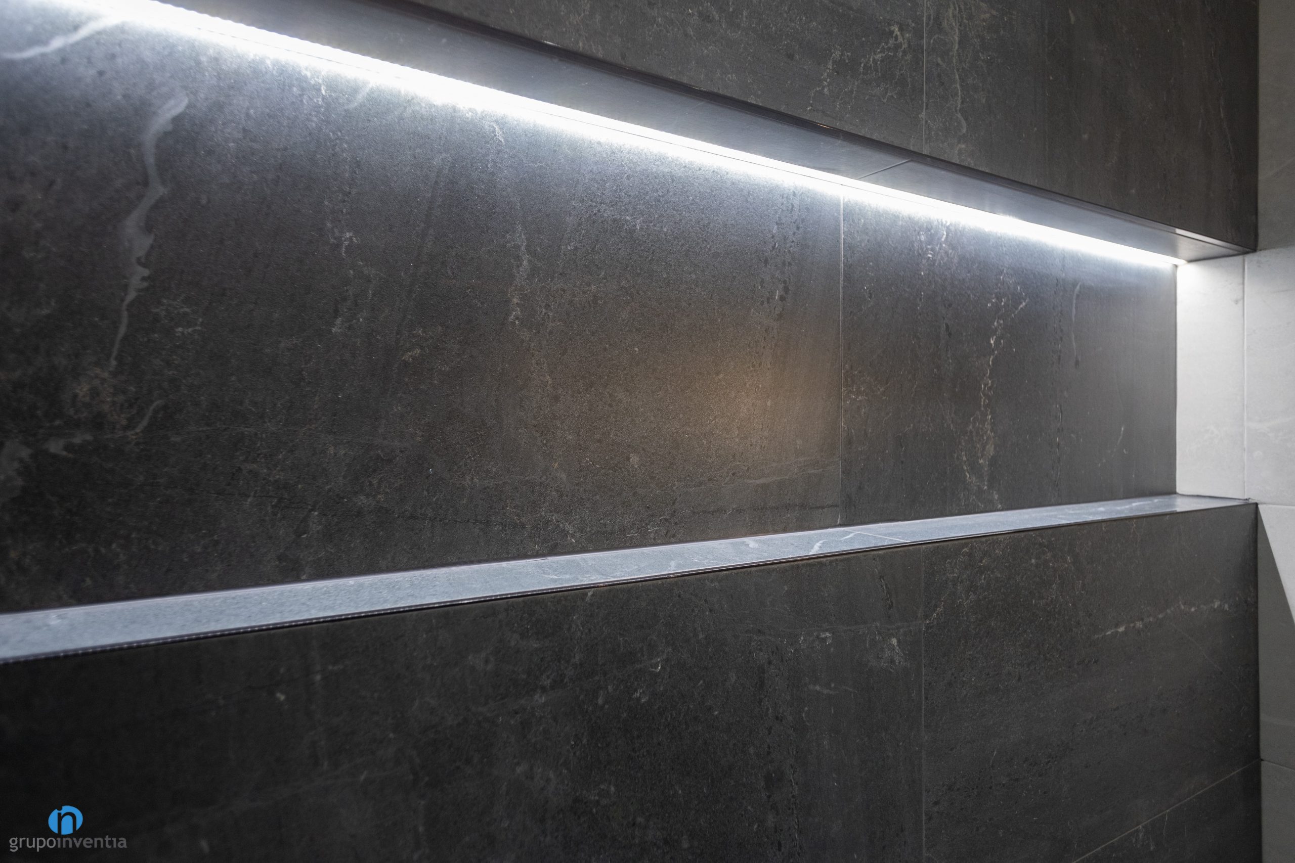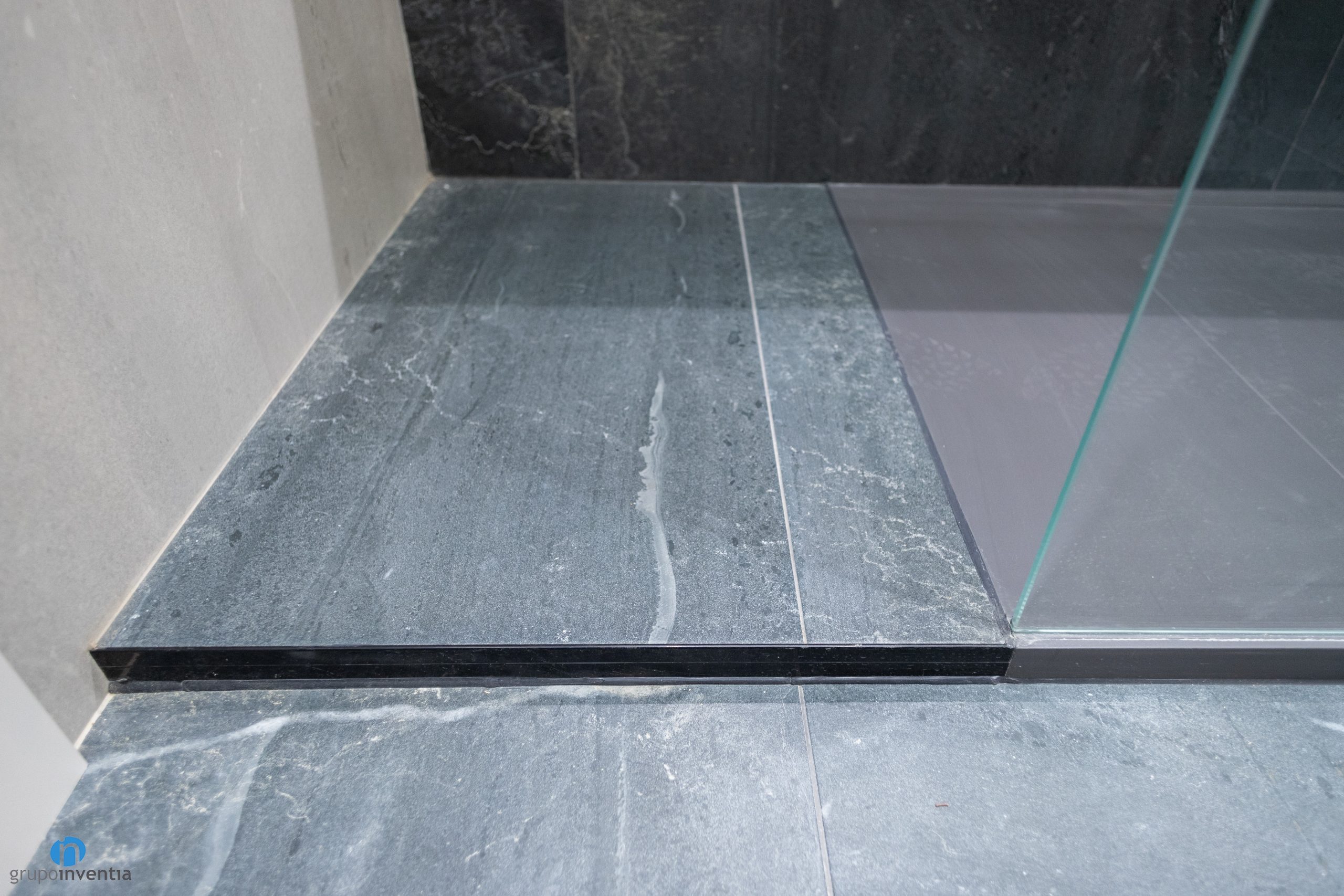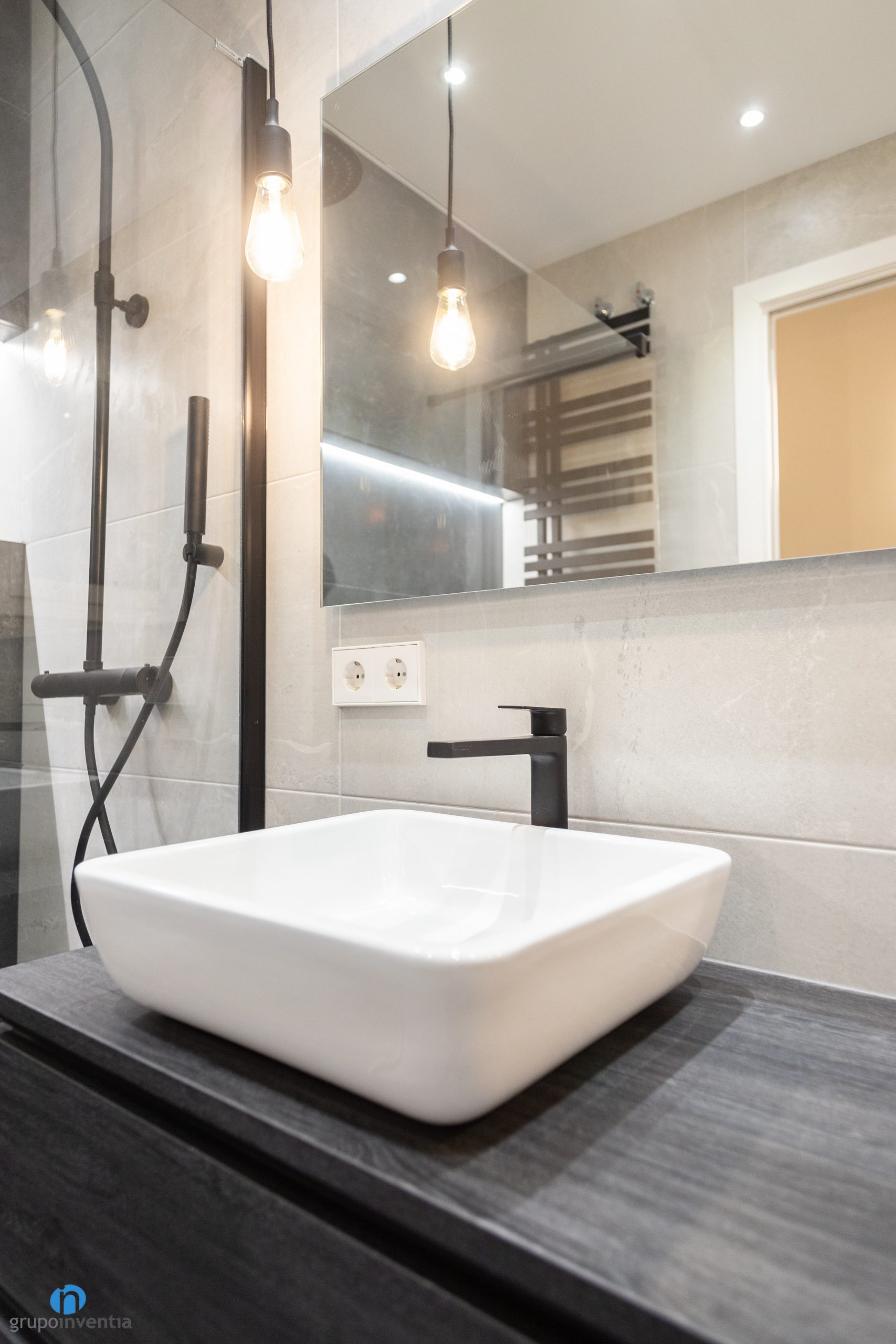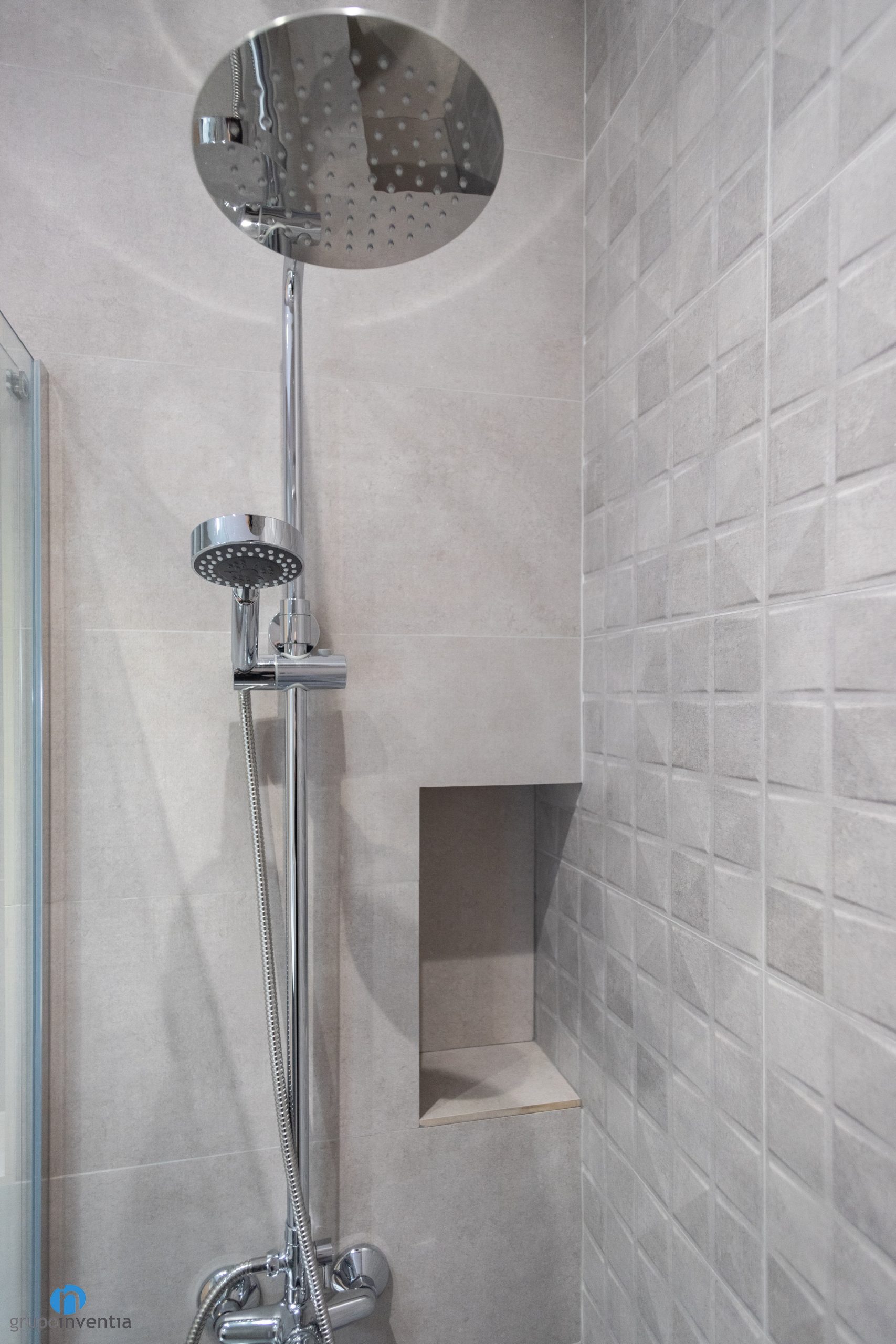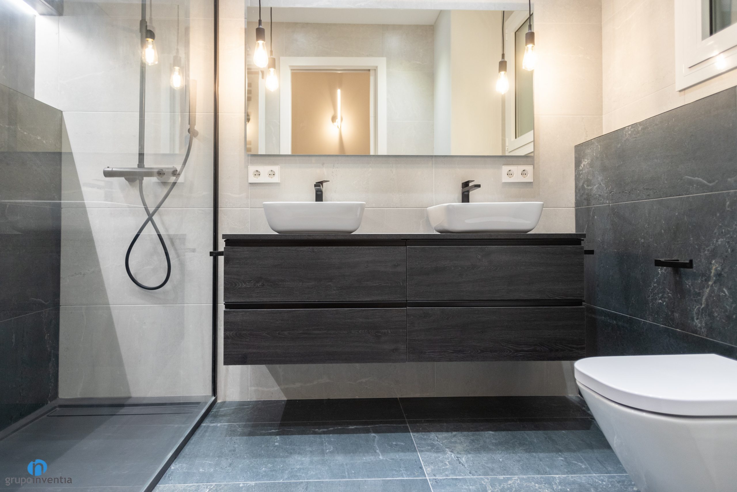 Otros espacios mejorados en esta reforma integral son los cuartos de baño. En ambos se ha utilizado un diseño interior similar con las paredes alicatadas con baldosas de color beige. Para el baño principal también se han utilizado baldosas con acabado en piedra que alicatan las paredes del inodoro y la ducha. El nuevo pavimento se presenta en tonos oscuros de gris y beige. Dos cuartos de baño con una imagen moderna y con un ambiente agradable.