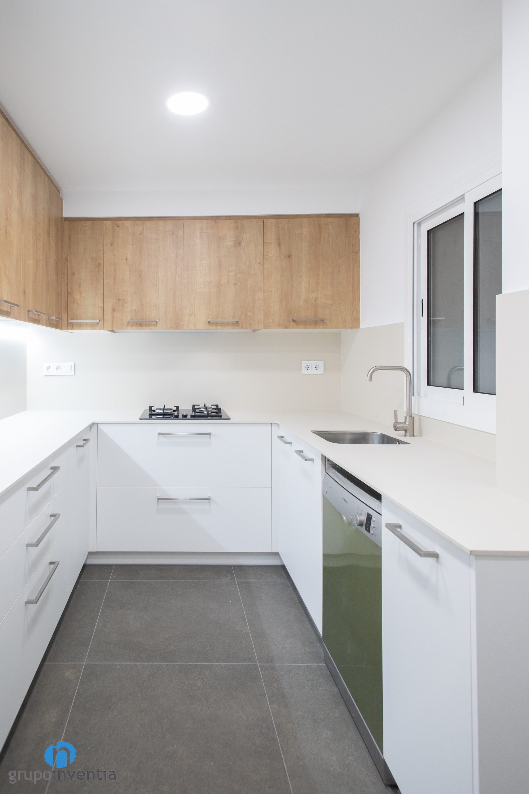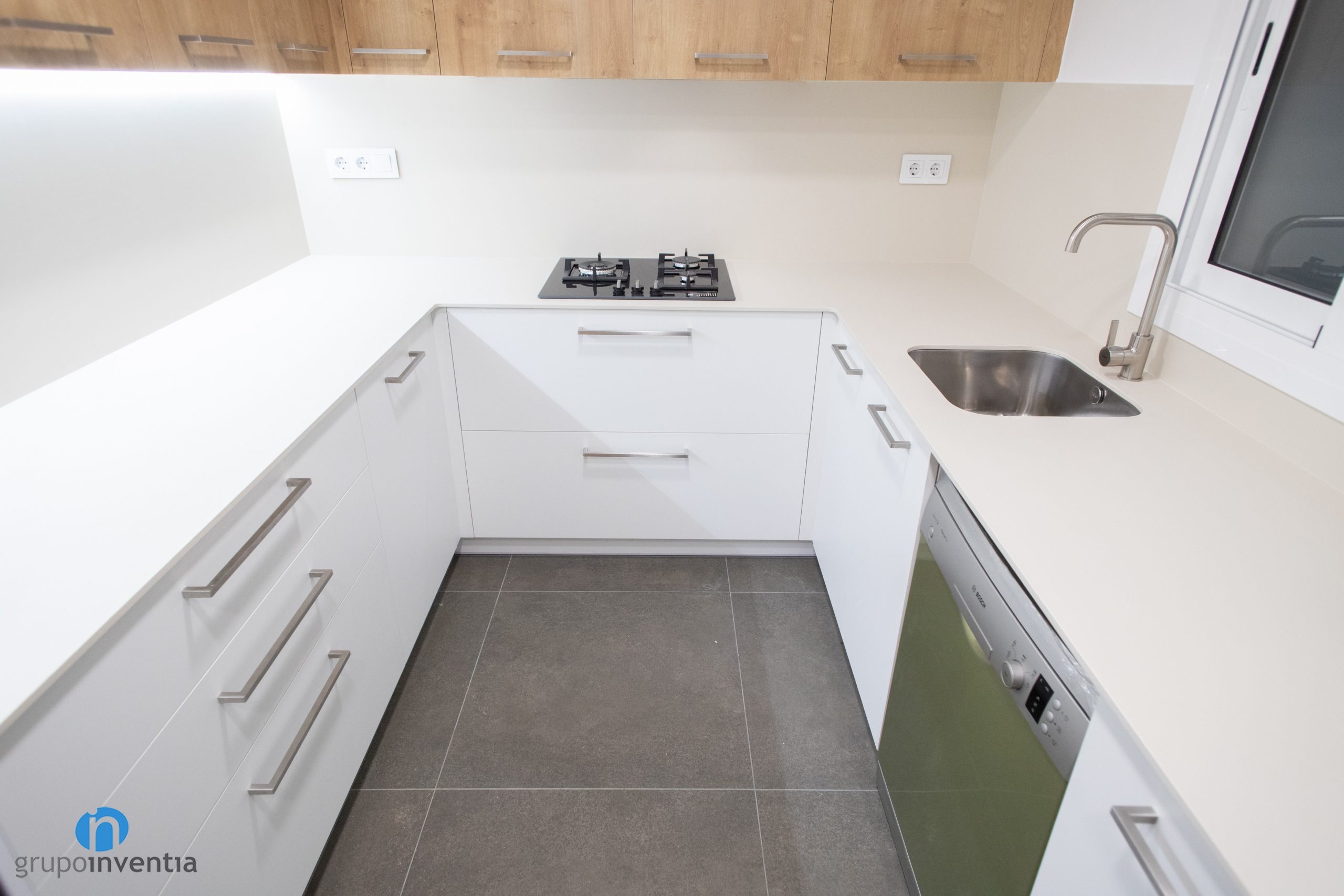A la cocina se accede a través de una puerta corredera y justo a la derecha de la entrada nos encontramos con la nevera integrada. Para la nueva disposición de sus elementos se ha optado por una distribución de cocina en U. De este modo todo el espacio queda muy bien aprovechado y permite una movilidad muy funcional.