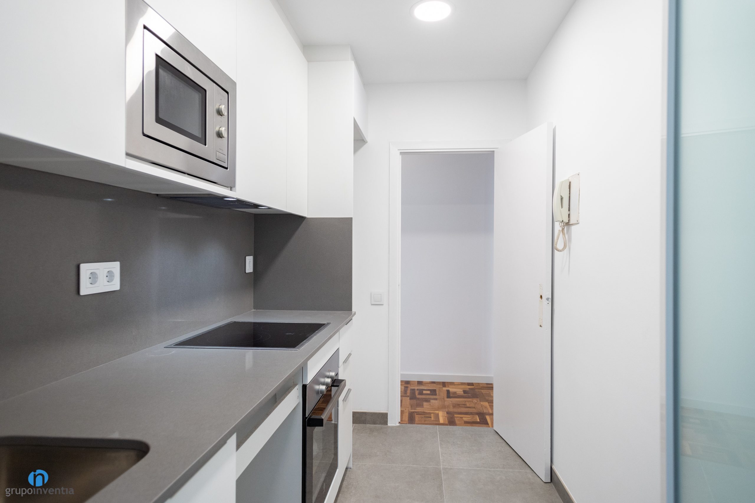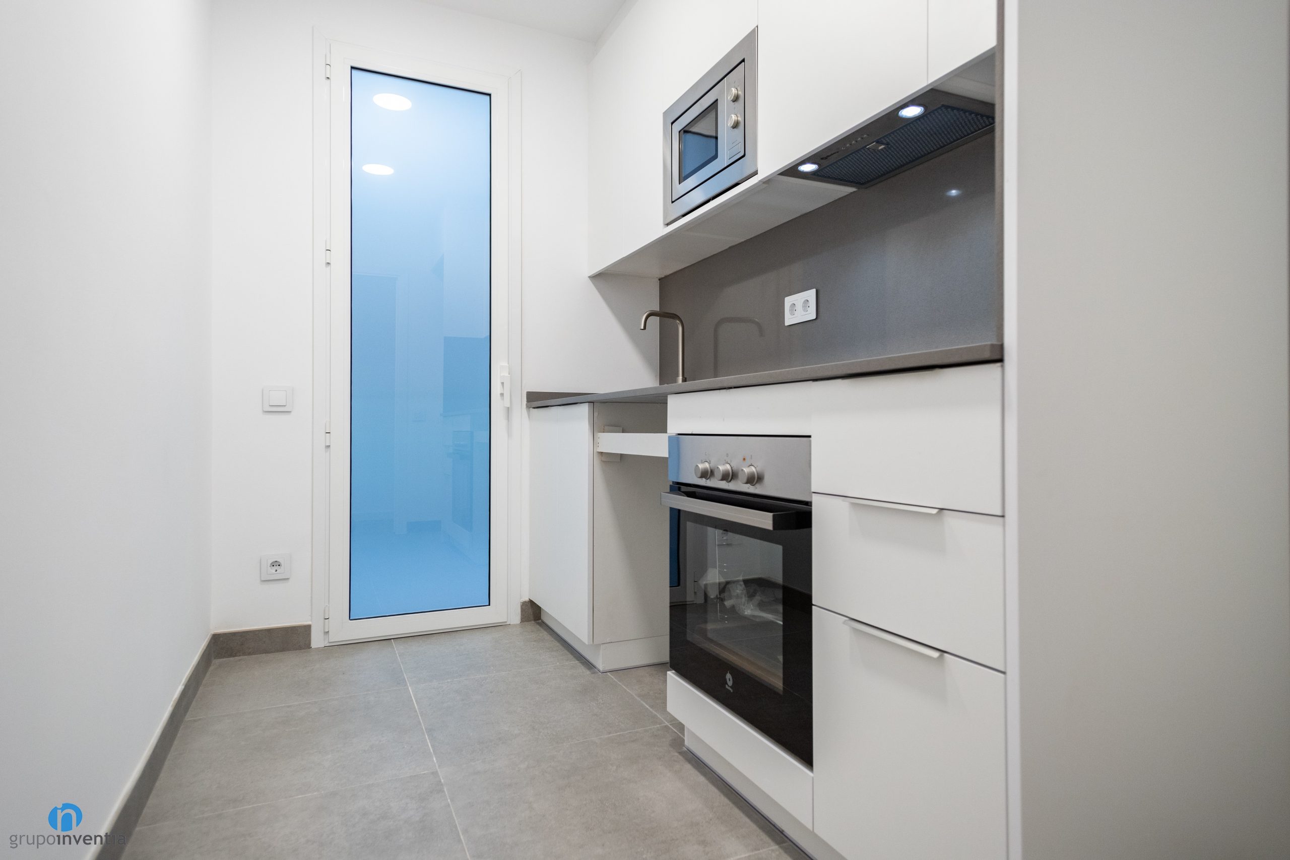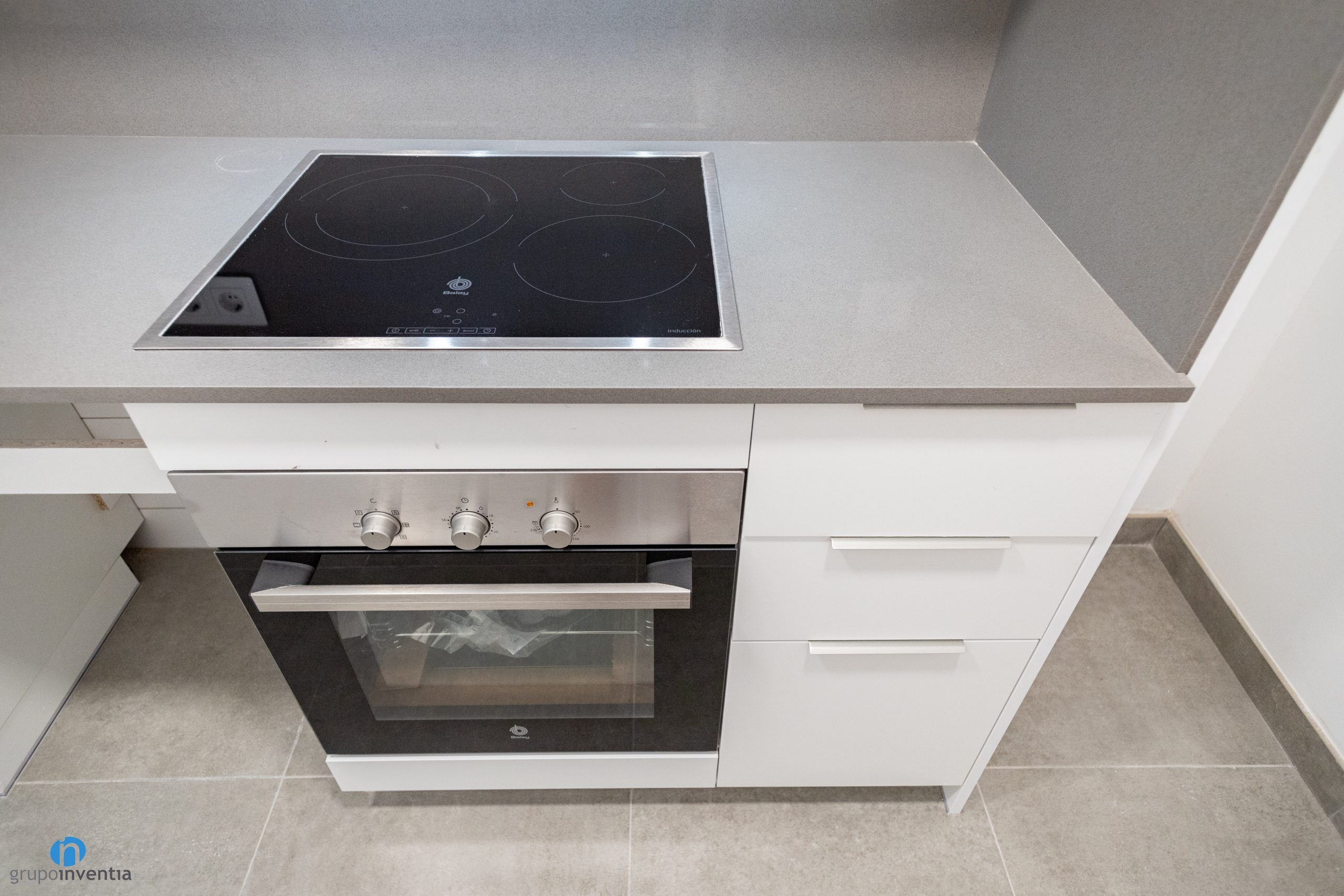 La cocina, imprescindible en un hogar, también se ha renovado por completo en imagen y equipamiento. Se ubica en una estancia propia y cuenta con una superficie rectangular. Dadas estas características se ha apostado por una distribución de cocina en forma de L. En el extremo derecho se ha dispuesto un hueco a medida para integrar la nevera.