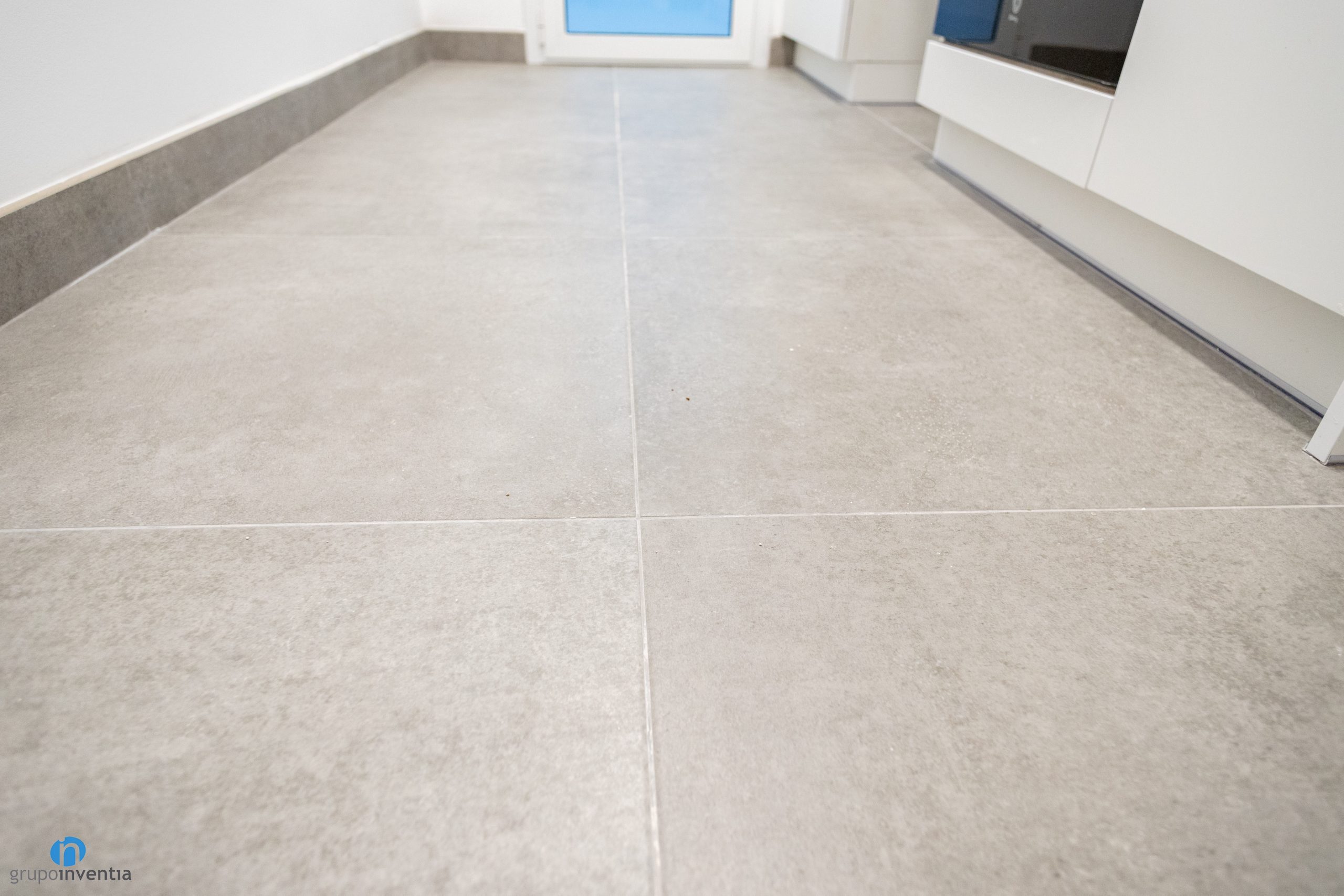 Otra de las mejoras de esta reforma de cocina la vemos en la imagen. Ahora cuenta con un mobiliario de color blanco que genera luminosidad y amplitud. También se ha renovado el suelo y se han colocado baldosas de gres en color gris. Se trata de un pavimento resistente que aporta mayor resistencia a esta cocina funcional.