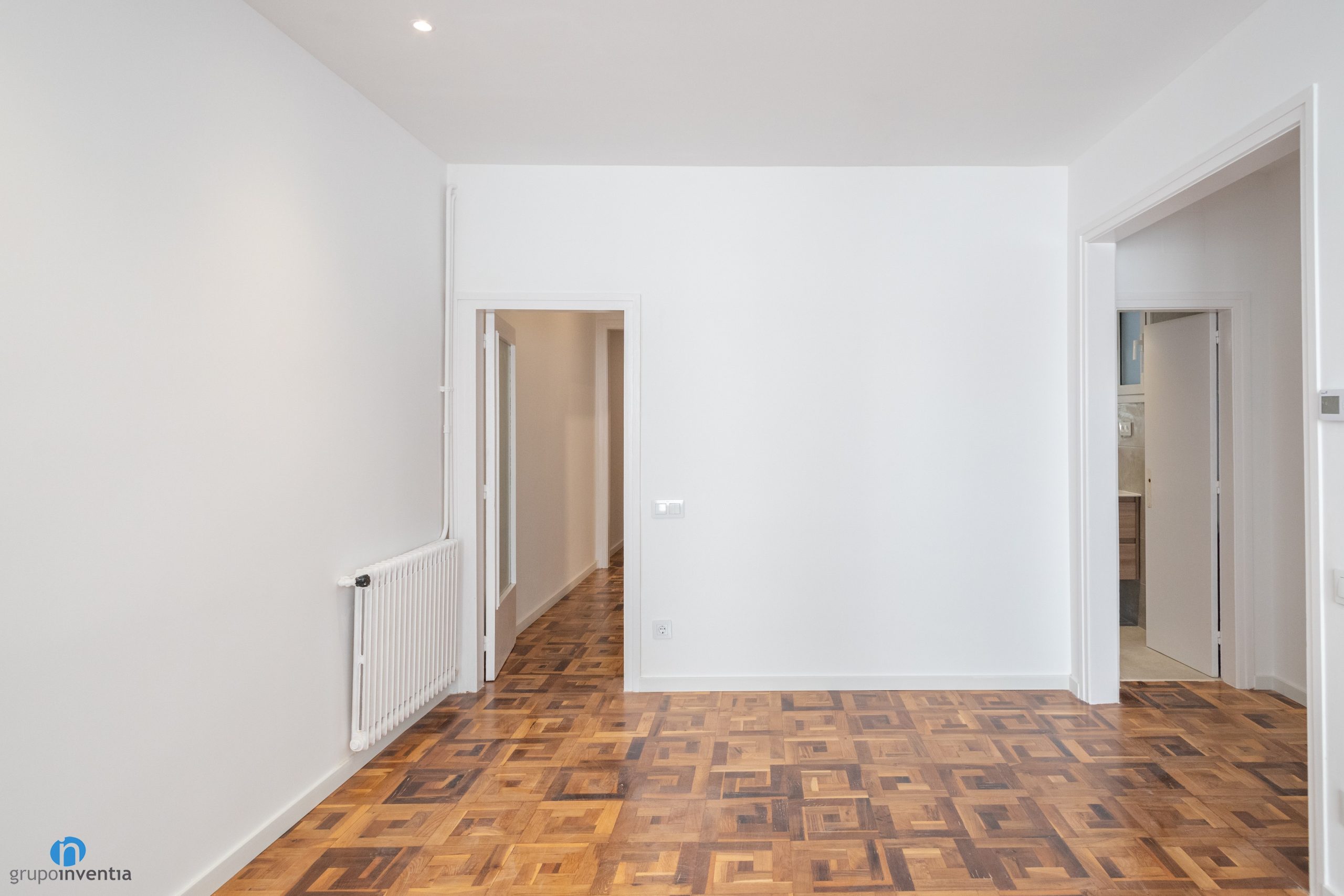 Por su parte los suelos originales se han mantenido y se ha realizado un trabajo de restauración en ellos. En la sala de estar se ha pulido y encerado el suelo de parquet original. De este modo se mantiene una imagen con mucha personalidad y que encaja a la perfección con el nuevo diseño global. Por su parte en los dormitorios se ha procedido del mismo modo con el suelo de terrazo original.