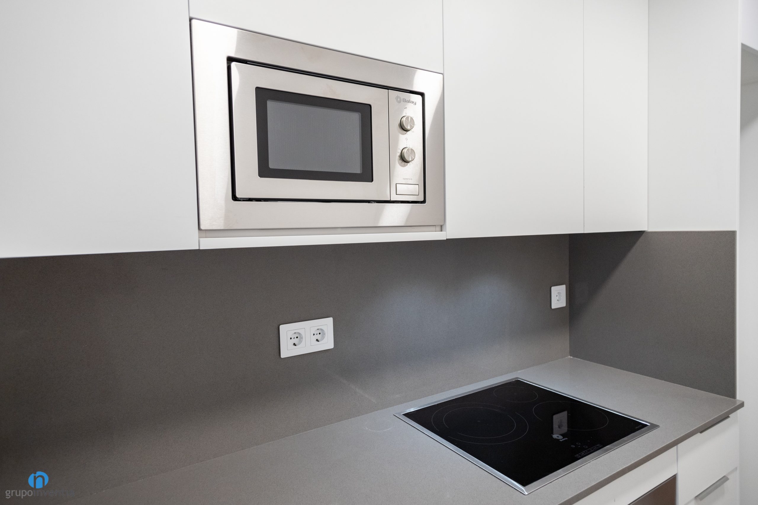 A partir de ahí nace una alargada encimera de color gris, generando un bonito contraste con el mueble de cocina blanco. La encimera aporta una amplia superficie de apoyo y de trabajo. Además está equipada con un fregadero de un seno y con una placa vitrocerámica. Tanto en la parte inferior como superior dispone de cajones y armarios para el almacenaje. Del mismo modo en estas zonas se han integrado el horno y el microondas respectivamente.