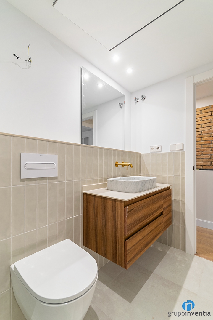 Las paredes se han alicatado con azulejos en tono beige que aportan luminosidad. Este acabado contrasta muy bien con el mueble de lavabo en madera natural. El resultado es una estancia elegante y muy acogedora.