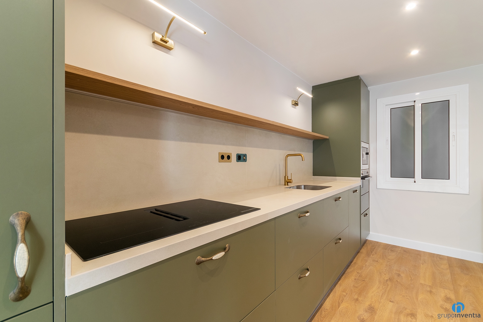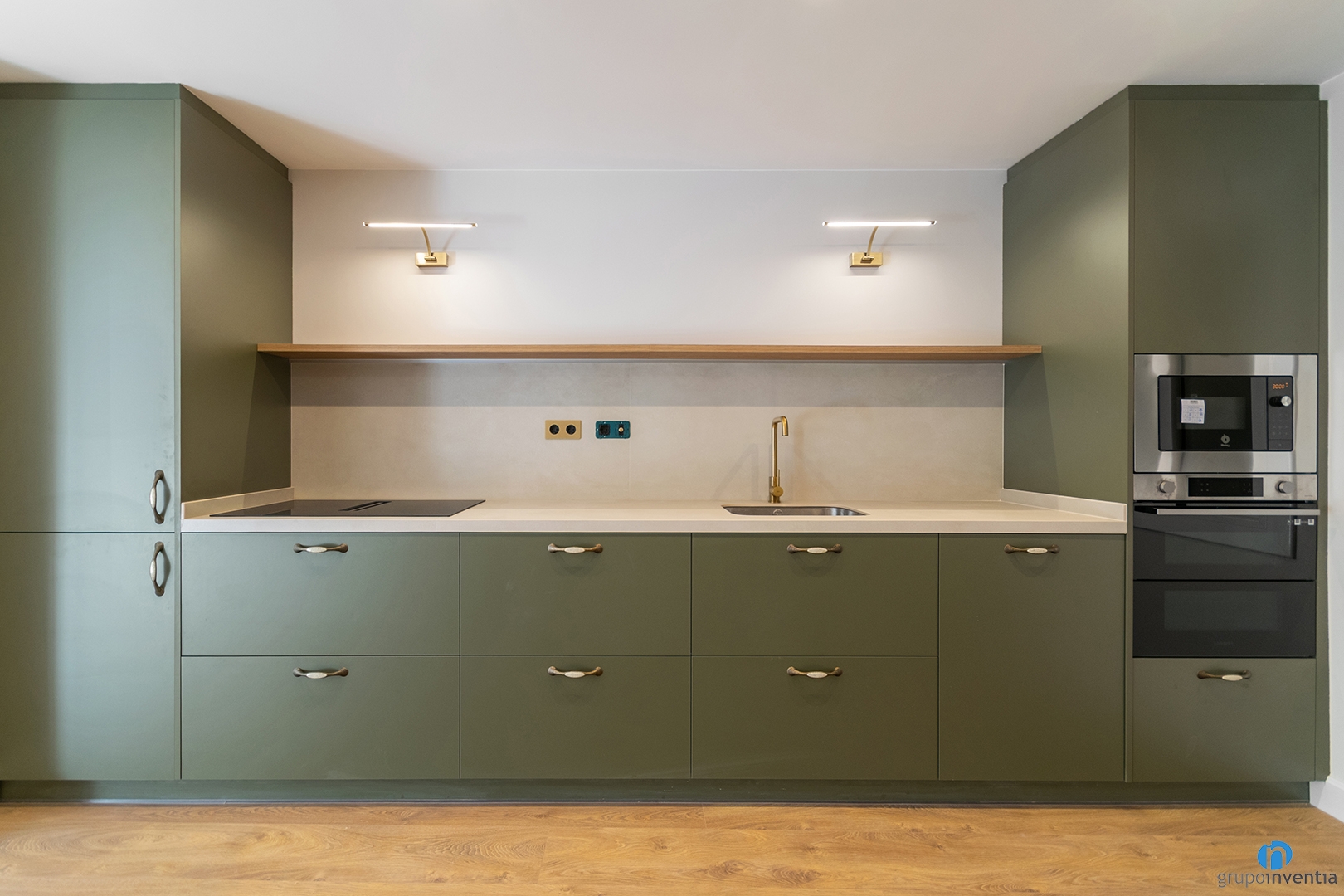 En uno de los extremos hemos integrado la nevera y en el otro el horno y el microondas. Entre ambos extremos se desarrolla una encimera amplia y funcional. Esta superficie de trabajo está equipada con una placa de inducción y un fregadero de un seno.