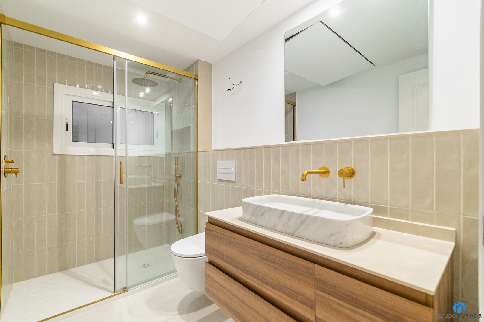 Otro detalle destacado es el acabado dorado de la grifería del lavabo y de la ducha. Este elemento aporta personalidad al espacio. Gracias a estas decisiones hemos conseguido un baño moderno y visualmente amplio.