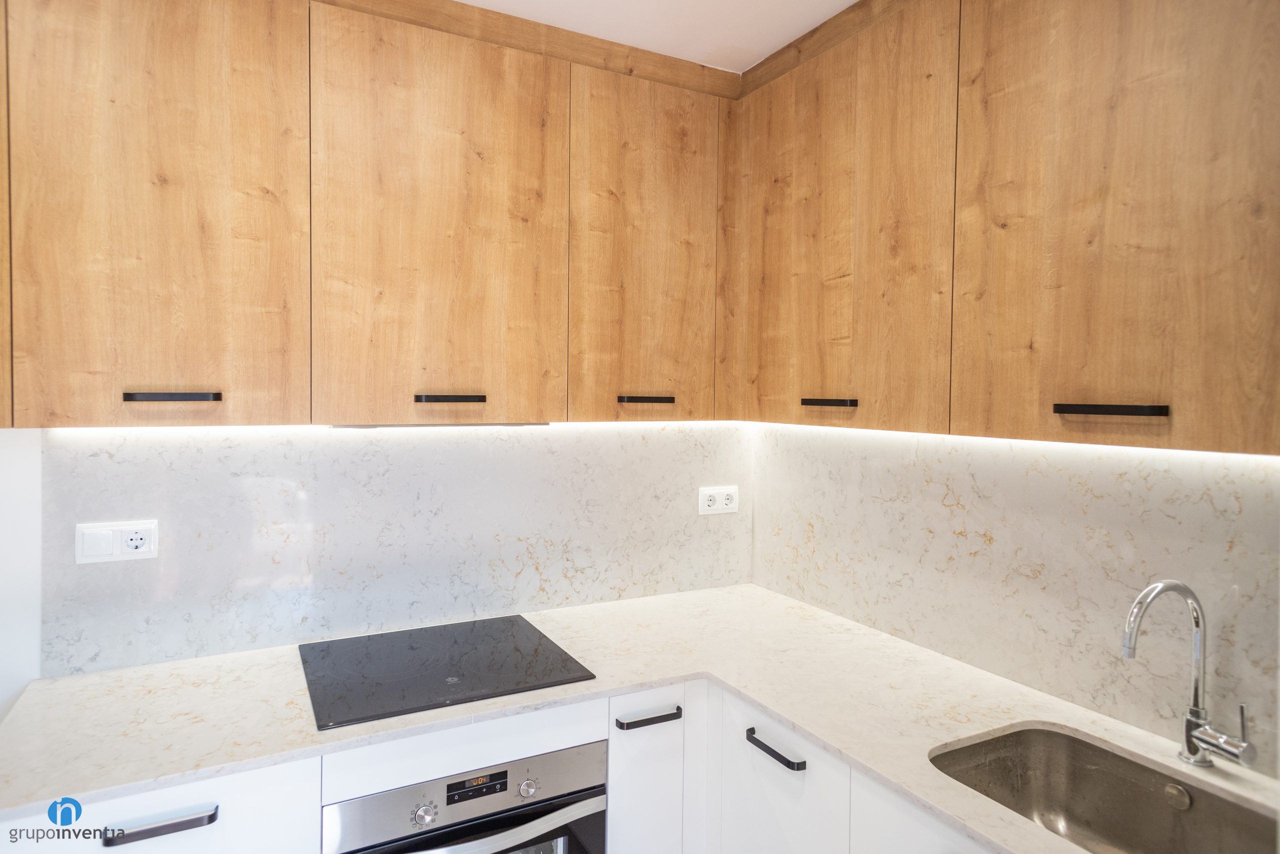 La cocina también cuenta con una amplia capacidad de almacenaje. Se han colocado varios cajones y armarios tanto en la parte baja como alta de las encimeras. El mueble inferior se presenta en color blanco. Los armarios superiores lucen un acertado acabado en madera. En ambos casos los tiradores son discretos y de color negro.