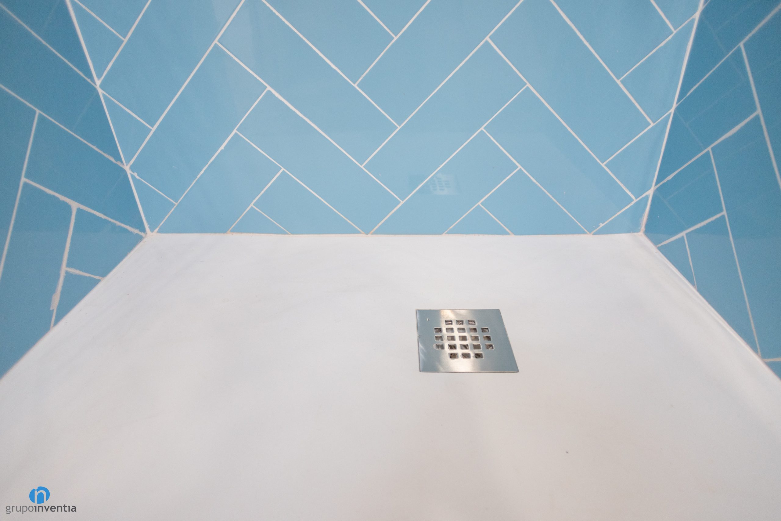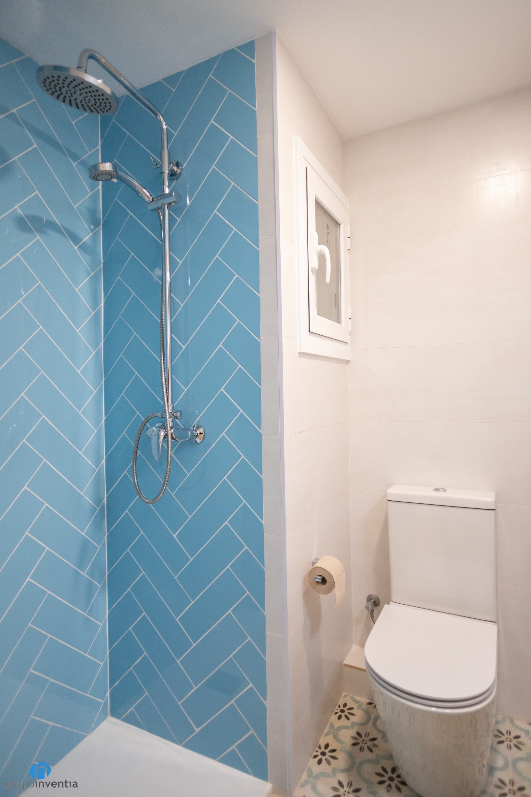 La mayoría de paredes del cuarto de baño se han alicatado con azulejos de color blanco. Al igual que en el resto de la vivienda se presenta como un espacio muy luminoso y visualmente amplio. Se ha añadido color con el alicatado de la pared de la ducha. En este caso se han utilizado baldosas rectangulares de color azul. Se han colocado en diagonal, un efecto que genera dinamismo y modernidad.