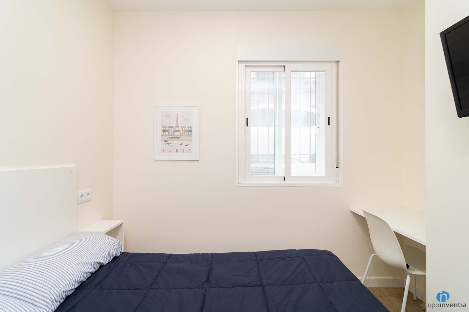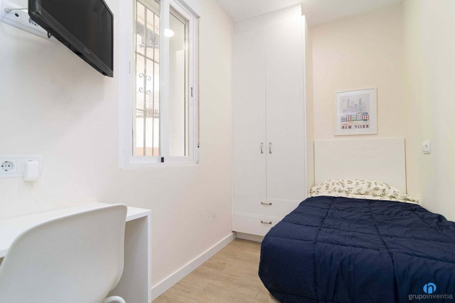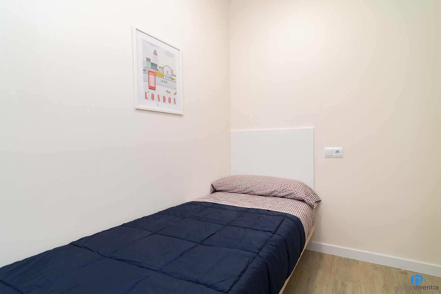 También nos hemos encargado de colocar el nuevo suelo de parquet en tono de madera natural. Gracias a este detalle conseguimos generar calidez en espacios como los dormitorios. Cada habitación está amueblada con una cama, un armario y una zona de estudio.
