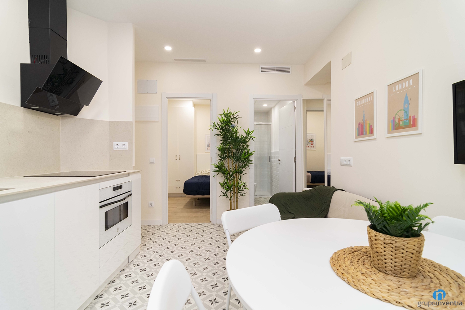 La nevera queda integrada en el mismo mueble de cocina de color blanco, al igual que la lavadora y el lavavajillas. Se ubica en el extremo izquierdo, lista para ofrecer las mejores prestaciones. Como hemos mencionado, la cocina es abierta al comedor y al salón. Un espacio funcional que también nos hemos encargado de amueblar. Dispone de una mesa redonda con varias sillas y de un cómodo sofá.