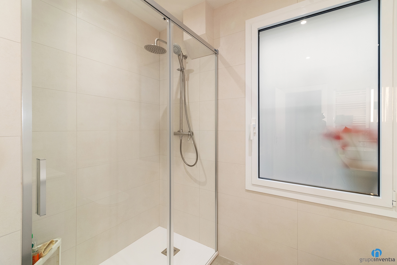 Otro espacio mejorado en esta reforma integral en Sitges es el cuarto de baño. La imagen de este espacio de aseo sigue las líneas generales del resto de la vivienda. Hemos usado tonos neutros para crear un espacio acogedor para el uso diario. De este modo la pared tiene azulejos de tono beige combinado con un pavimento en acabado piedra.