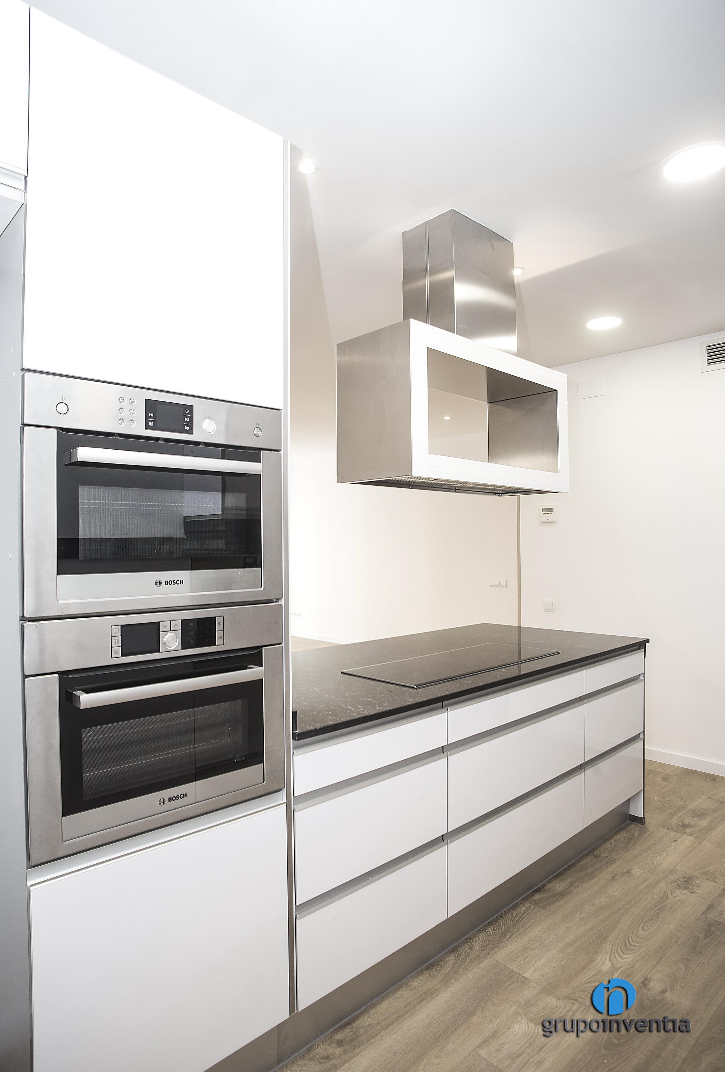 En el lado derecho, el abierto al salón, se colocó un nuevo tramo de encimera en el que se instaló una placa vitrocerámica. Además, este ofrece una amplia superficie de apoyo y de trabajo y puede utilizarse como barra de cocina. Ya en su extremo, se encastraron un horno, un microondas y una nevera.