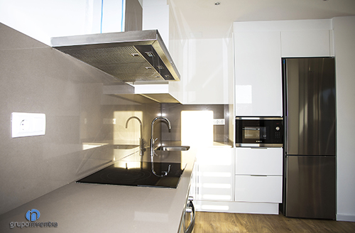 Para el diseño de esta reforma de cocina se utilizaron el color blanco, en todo el mueble de cocina, y el gris, en la encimera y el salpicadero.