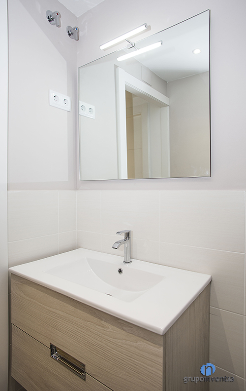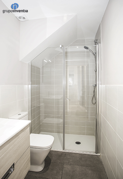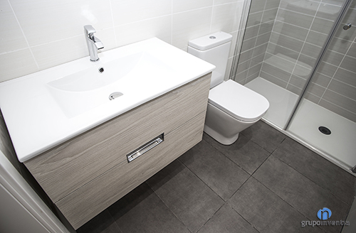 La vivienda contaba con dos cuartos de baño: el suite y el de cortesía. En ambos casos se llevó a cabo una rehabilitación completa tanto de diseño interior como de instalación de equipamiento sanitario. De este modo, cada reforma de baño cuenta con un lavabo con mueble almacenador incorporado, un inodoro y una ducha protegida con mamparas de puertas correderas.
