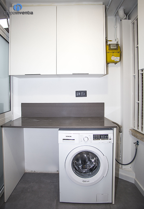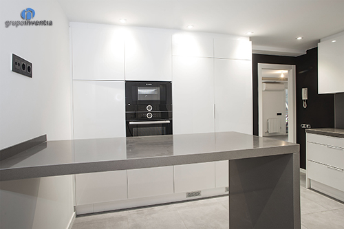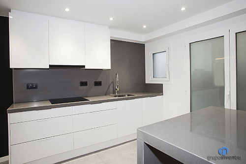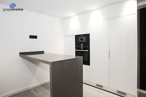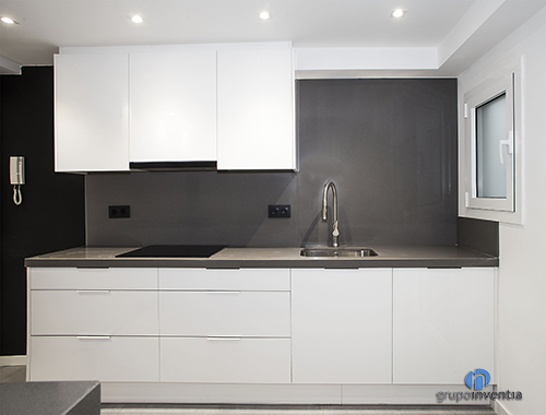 En este caso la cocina ocupa una estancia independiente y con una amplia superficie, por lo que contamos con un gran espacio a la hora de distribuir sus nuevos elementos. A la izquierda de la entrada se colocó el tramo de encimera principal, que se equipó con una placa vitrocerámica y un fregadero de un sólo seno. Este espacio también dispone de varios cajones y armarios para el almacenaje en la cocina tanto en la parte inferior como superior de la encimera.