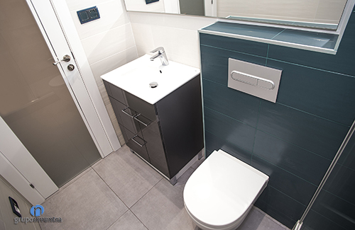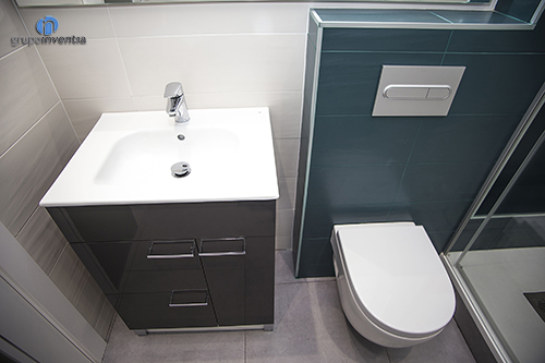 En cuanto al equipamiento sanitario, esta reforma de baño cuenta con un lavabo con mueble incorporado, un inodoro suspendido y una ducha protegida por mamparas de puertas correderas. Sin duda se consiguió una estancia con un diseño muy enérgico y que ofrece un uso muy funcional.