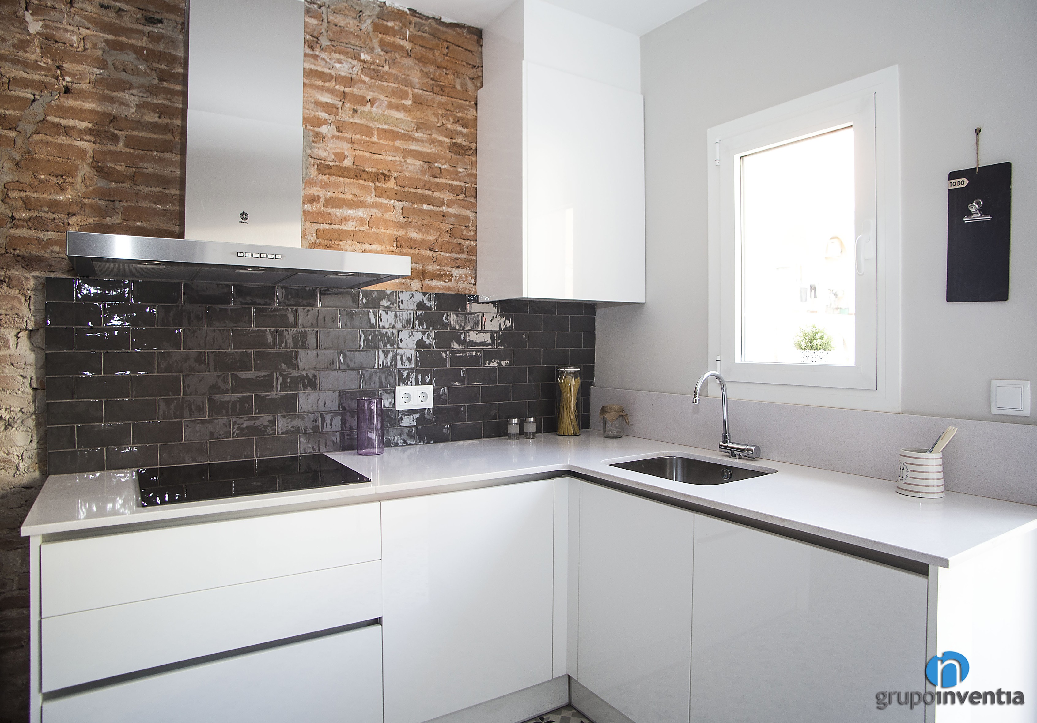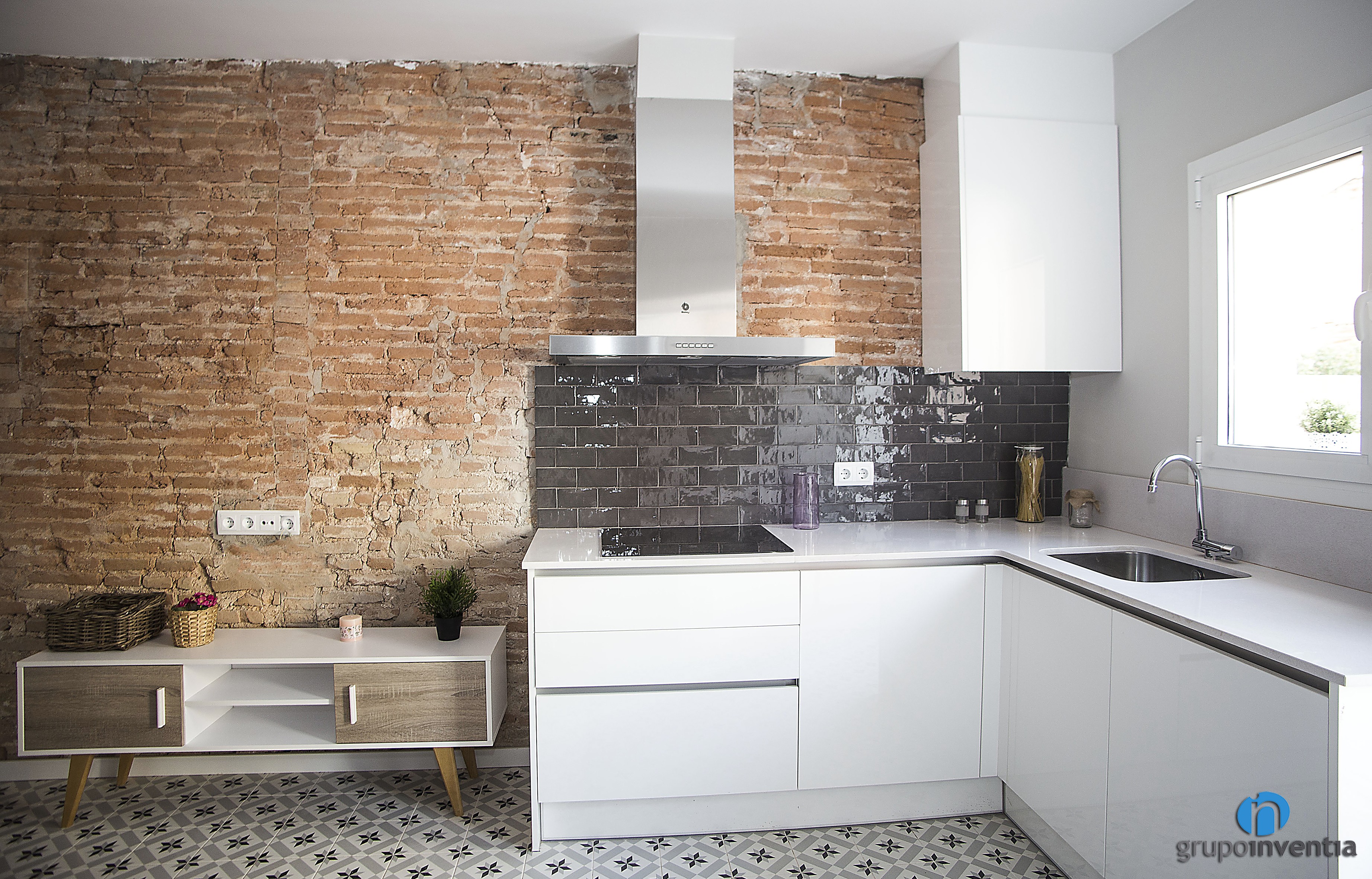 El diseño de esta reforma de cocina también está muy cuidado. El mueble de cocina, que ofrece capacidad de almacenaje en la parte inferior de la encimera es blanco, mientras que el salpicadero está alicatado con azulejos grises. Todo ello encaja muy bien con la pared de ladrillo visto del salón.