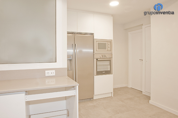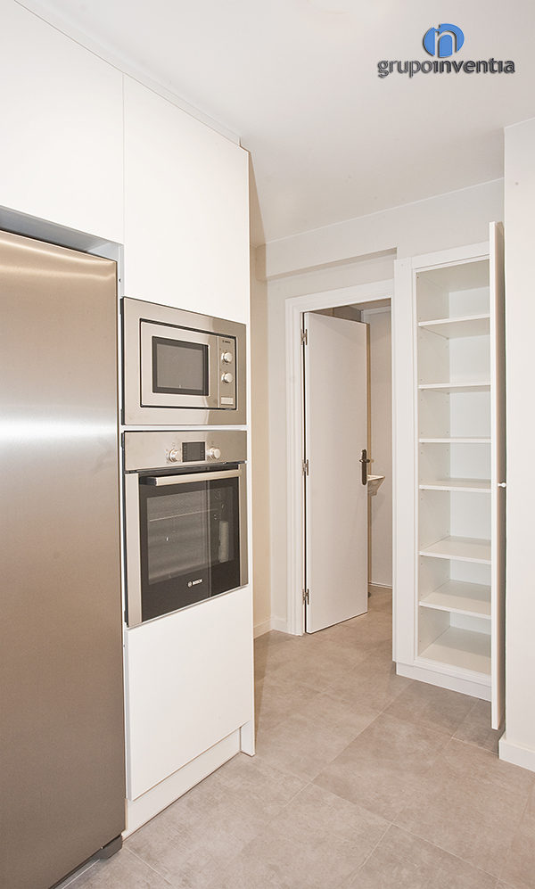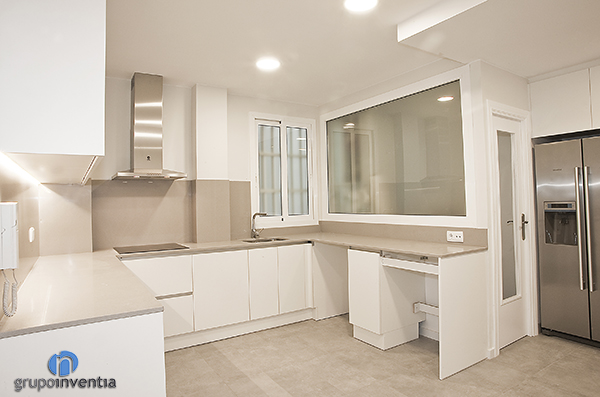 La reforma de cocina ocupa un espacio independiente y se utilizó una distribución en U. En ella los tramos de encimera de la derecha y de la izquierda se destinaron a superficie de apoyo, mientras que en la encimera central se instalaron una placa vitrocerámica y un fregadero de un solo seno. Por su parte, los electrodomésticos se encastraron en la parte derecha.