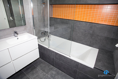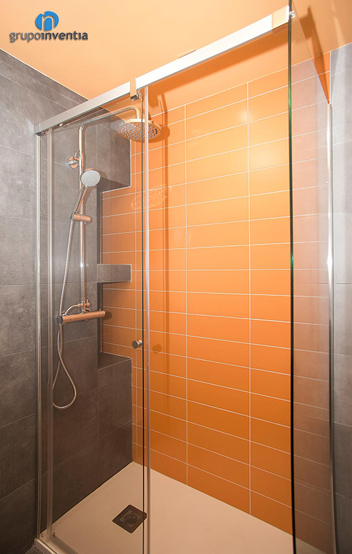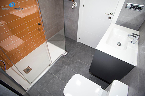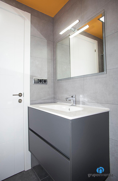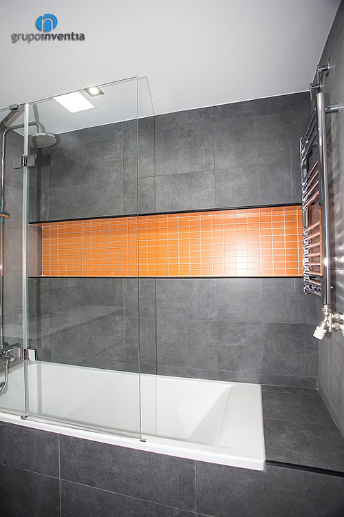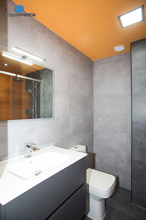 La vivienda contaba con dos cuartos de baño y ambos se rehabilitaron para que ofrecieran las mejores prestaciones en su uso. Como hemos mencionado, se aportó por un diseño muy enérgico que combina tonos oscuros con naranjas a través del alicatado de las paredes, el mobiliario y el pavimento instalado.
