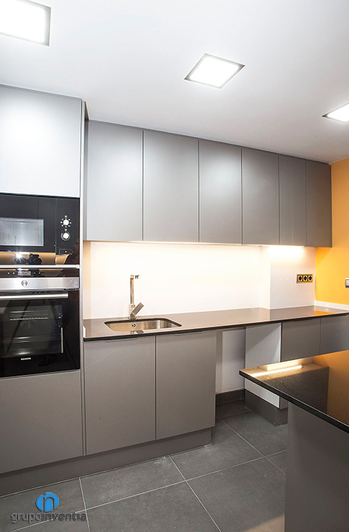 La reforma de cocina, abierta al salón, ofreció muchas posibilidades y de ahí su espectacular nueva imagen. En la parte derecha de la estancia se dispuso una cocina lineal que cuenta con electrodomésticos encastrados, nevera, horno y microondas, y un tramo de encimera equipado con un fregadero individual. Además, esta zona cuenta con una amplia capacidad de almacenaje disponiendo de varios armarios y cajones.