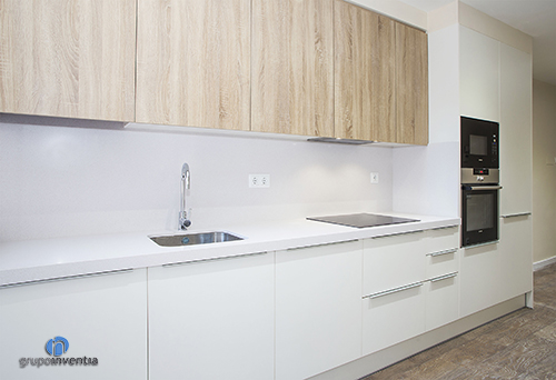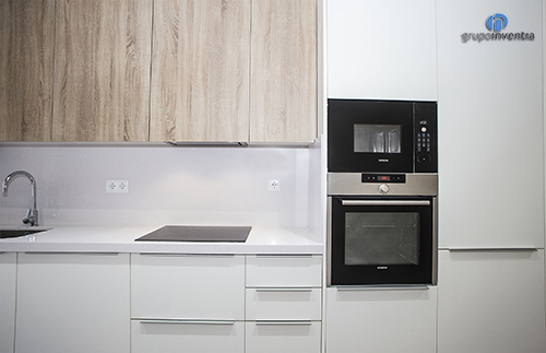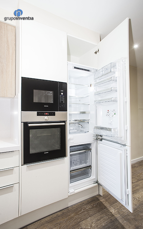 En el extremo d ella parte derecha de esta reforma de cocina, se encastraron los electrodomésticos, compuestos por una nevera, un horno y un microondas. A continuación nace la encimera, que llega hasta el otro extremo.