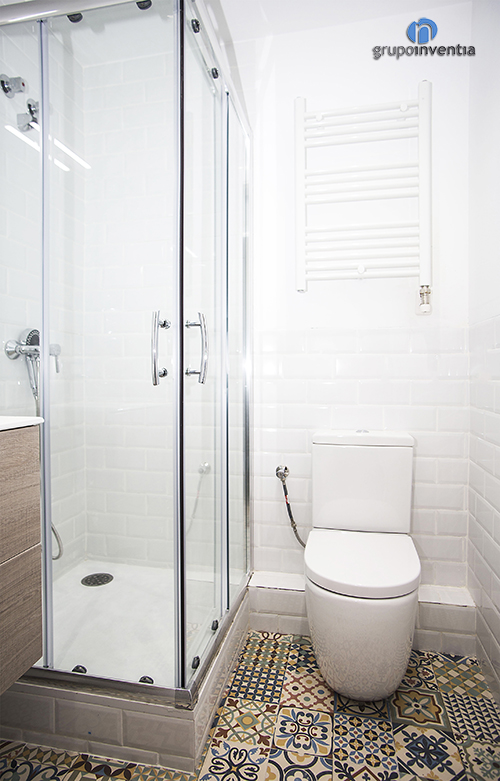 Para el diseño interior, las paredes se alicataron a media altura con azulejos biselados blancos y se pintó del mismo color el resto de pared. Ello se combina con un pavimento hidráulico que aporta mucha personalidad a ambas estancias.
