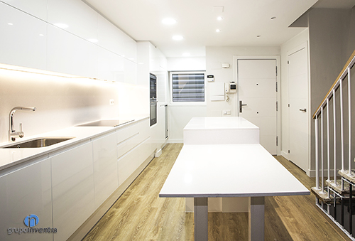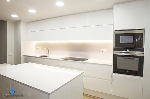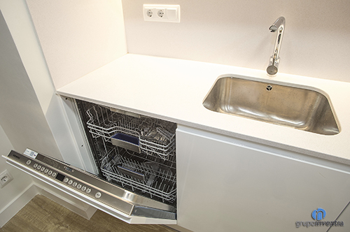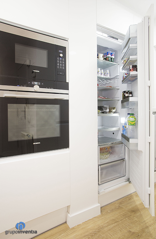 Además, esta zona de la reforma de cocina cuenta con un lavavajillas, un horno, un microondas y una nevera camuflada por las mismas puertas del armario. Todos estos electrodomésticos se encastraron, consiguiendo así aprovechar al máximo el espacio disponible.