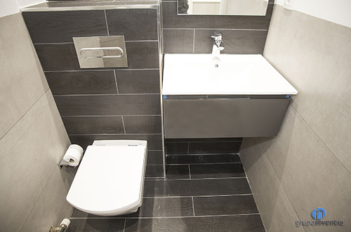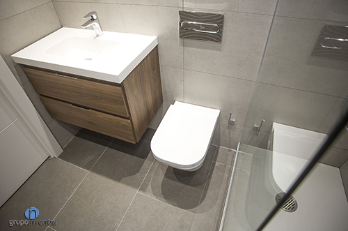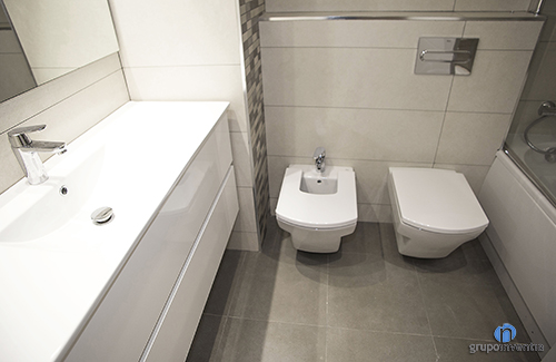 Cada reforma de baños cuenta con un lavabo con cajonera incorporada, inodoro suspendido y una zona de aguas. Mientras que en los baños complementarios este último elemento es una ducha, en la reforma de baño principal, que también dispone de bidet, se trata de una bañera.