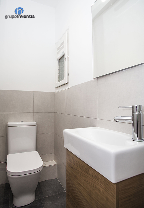 En los dos cuartos de baño con los que contaba el inmueble se aplicó un diseño muy similar. Las paredes se alicataron hasta media altura con azulejos de tono beige, mientras que el resto se pintó de color blanco. De entrada, esta nueva imagen ofrece mayor sensación de amplitud y combina perfectamente con el mueble de los lavabos con acabados en madera.
