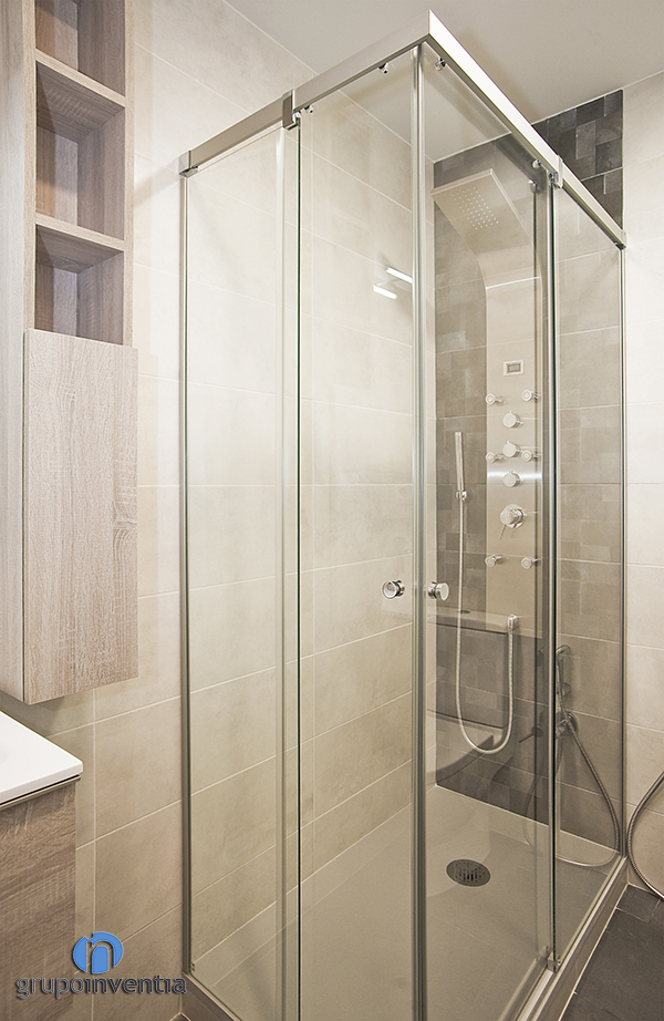 De este modo el cuarto de baño, que se alicató por completo con azulejos de color beige, cuenta con un lavabo con cajonera incorporada, un inodoro y una ducha protegida por una mampara de puertas correderas.